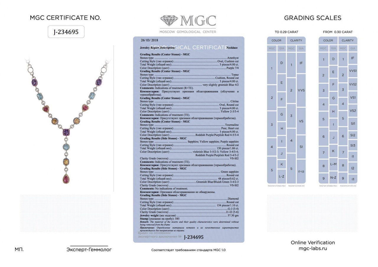 Ожерелье из белого золота с цветными камнями 18,48 карат и бриллиантами 1,1 карат (сертификат МГЦ)