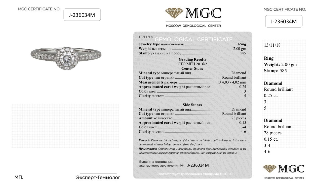 Кольцо из белого золота с бриллиантами 0,4 карат (сертификат МГЦ)