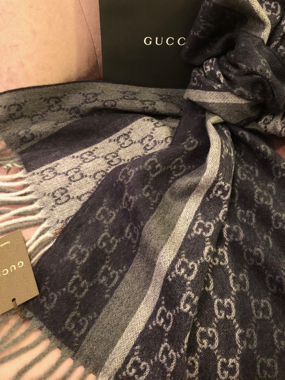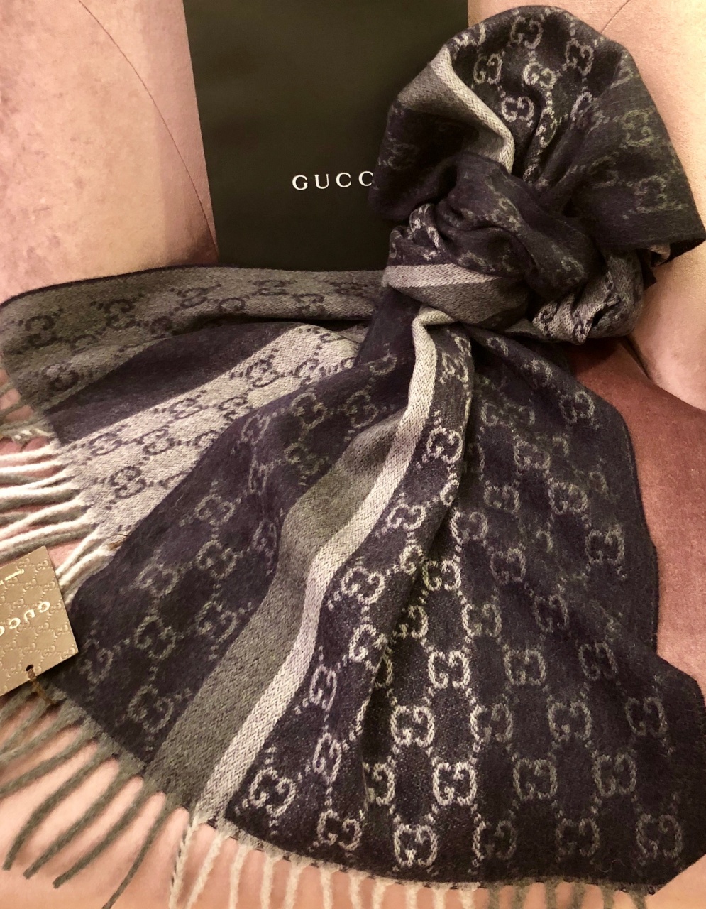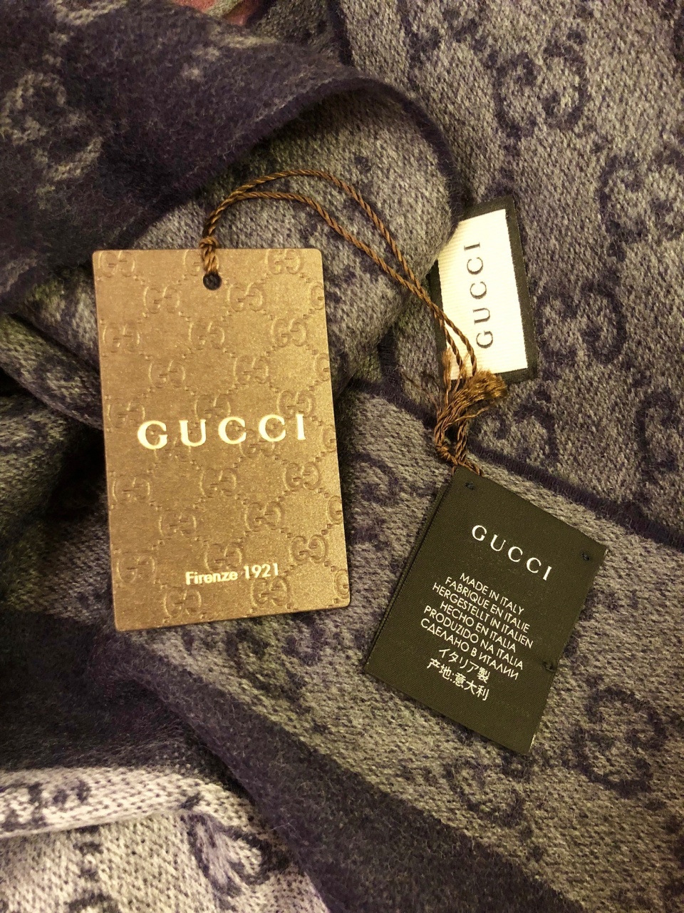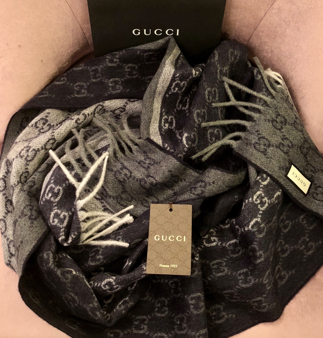 Шарф ⭐️ GUCCI ⭐️ Теплый, 50% КАШЕМИР 50% ШЕРСТЬ. Синие-фиалковый рисунок GG-Supreme, серая лента Web