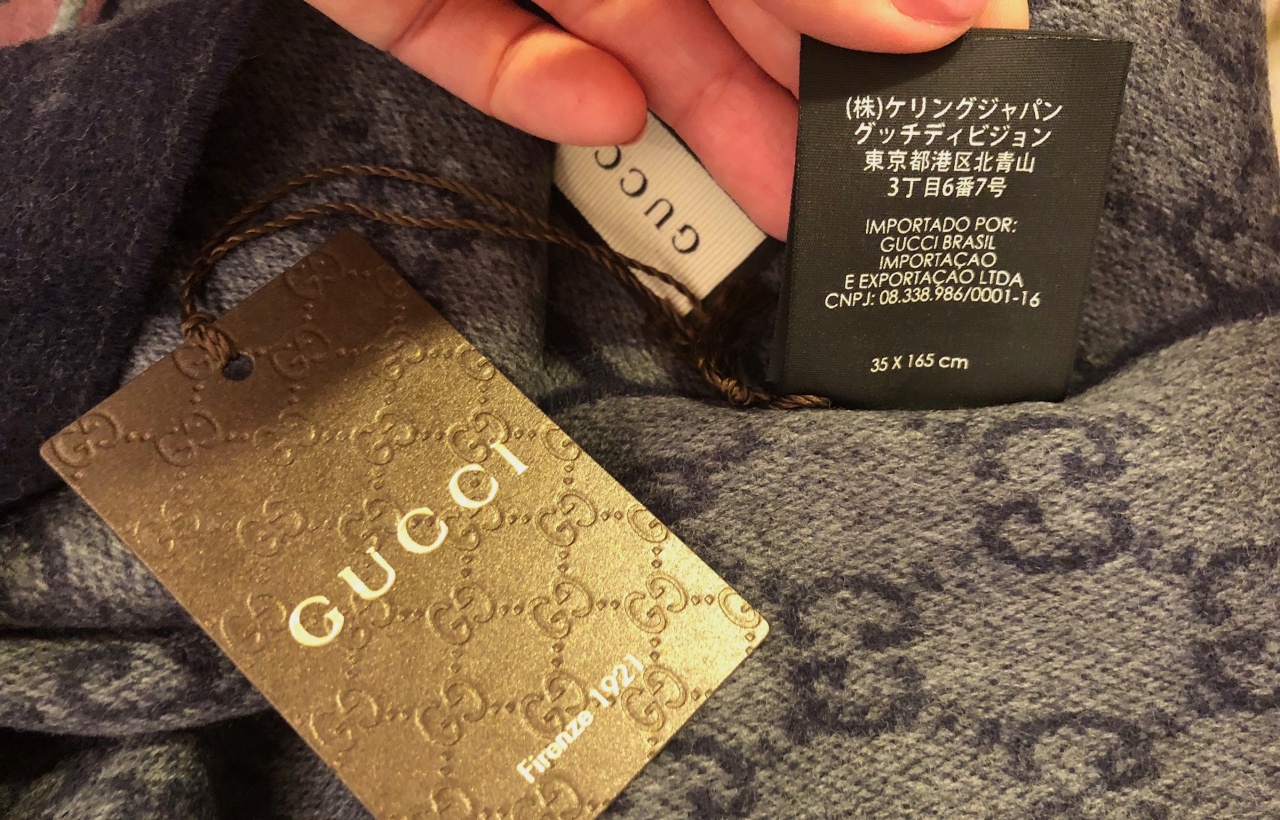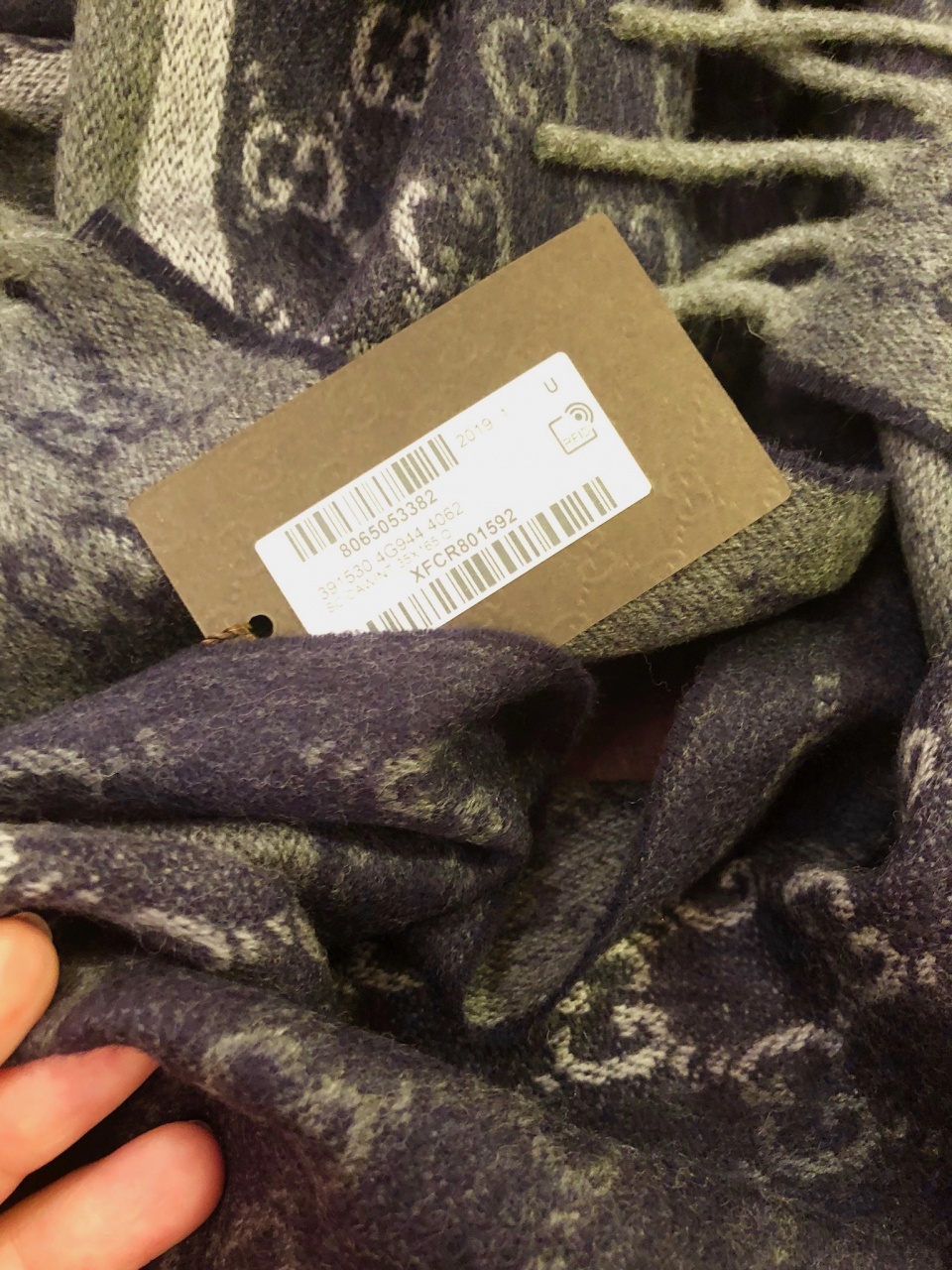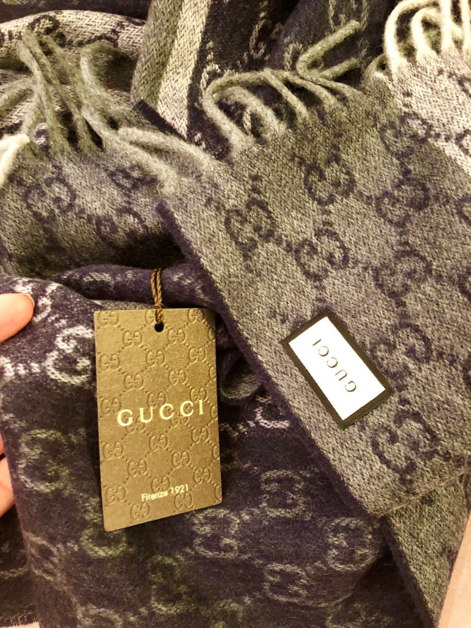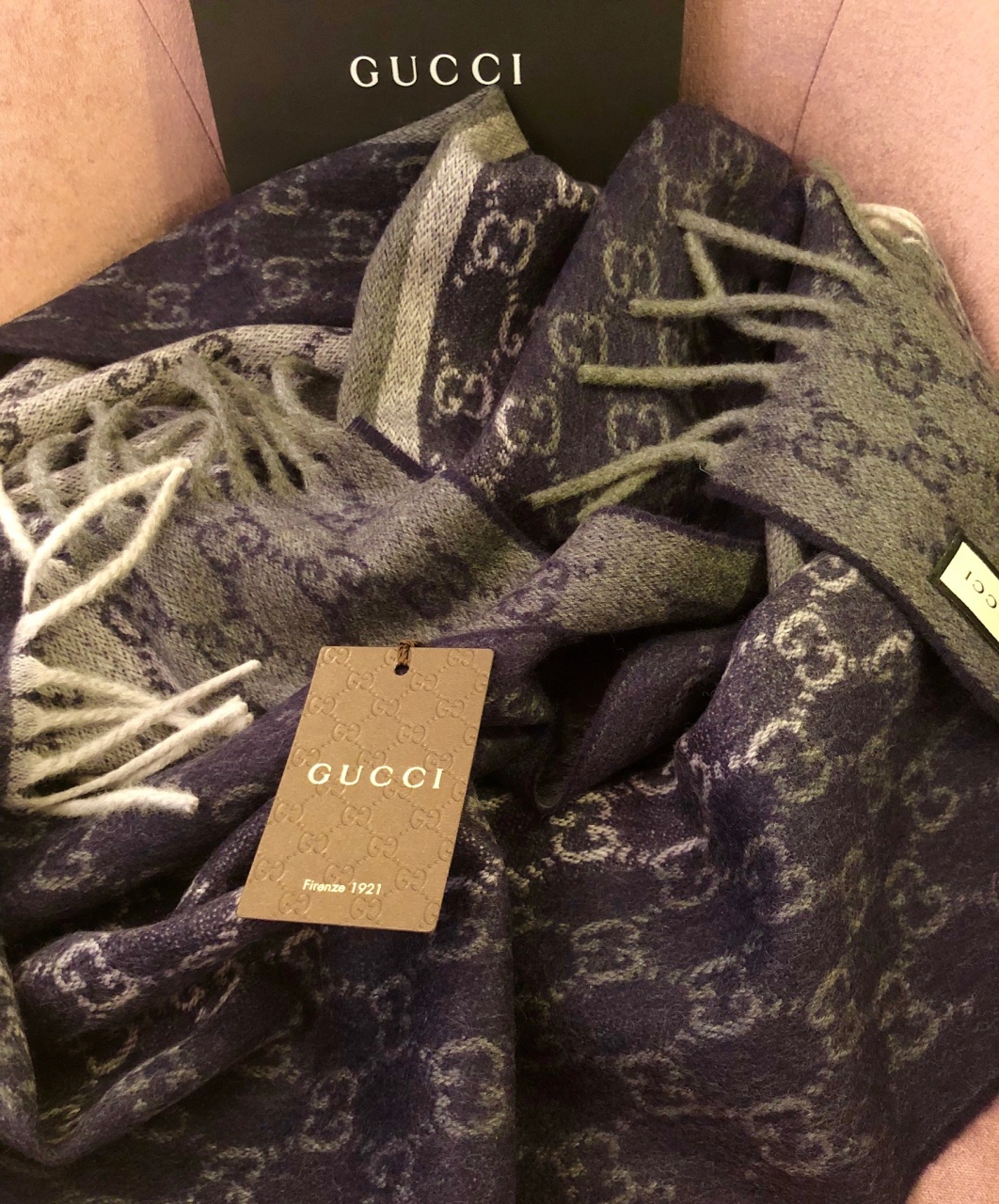 Шарф ⭐️ GUCCI ⭐️ Теплый, 50% КАШЕМИР 50% ШЕРСТЬ. Синие-фиалковый рисунок GG-Supreme, серая лента Web