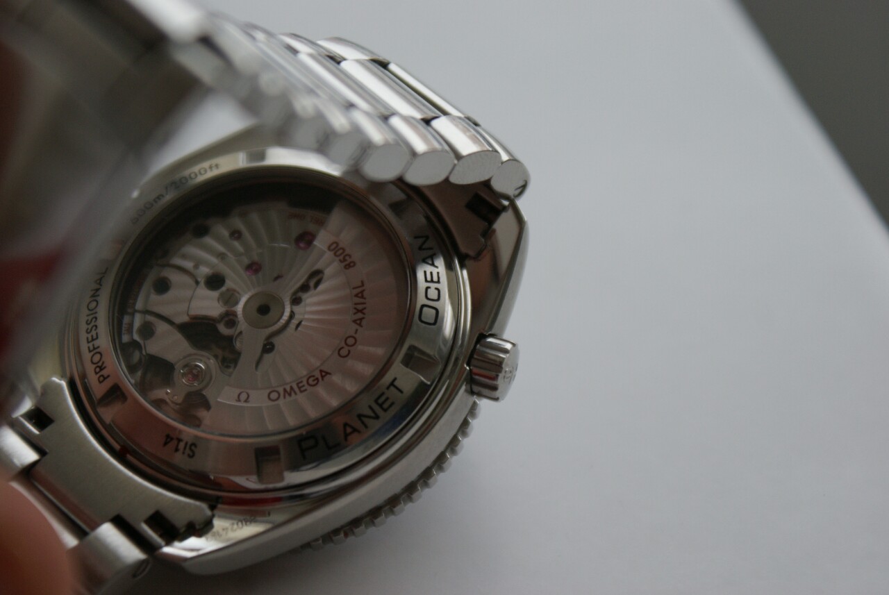 Коаксиальный калибр OMEGA 8500, часы год назад проходили проверку на точность, механическое сердце этого сертифицированного хронометра, хорошо виден через прозрачную заднюю крышку.