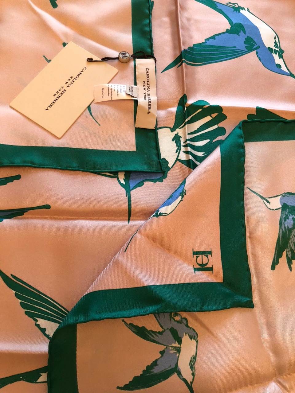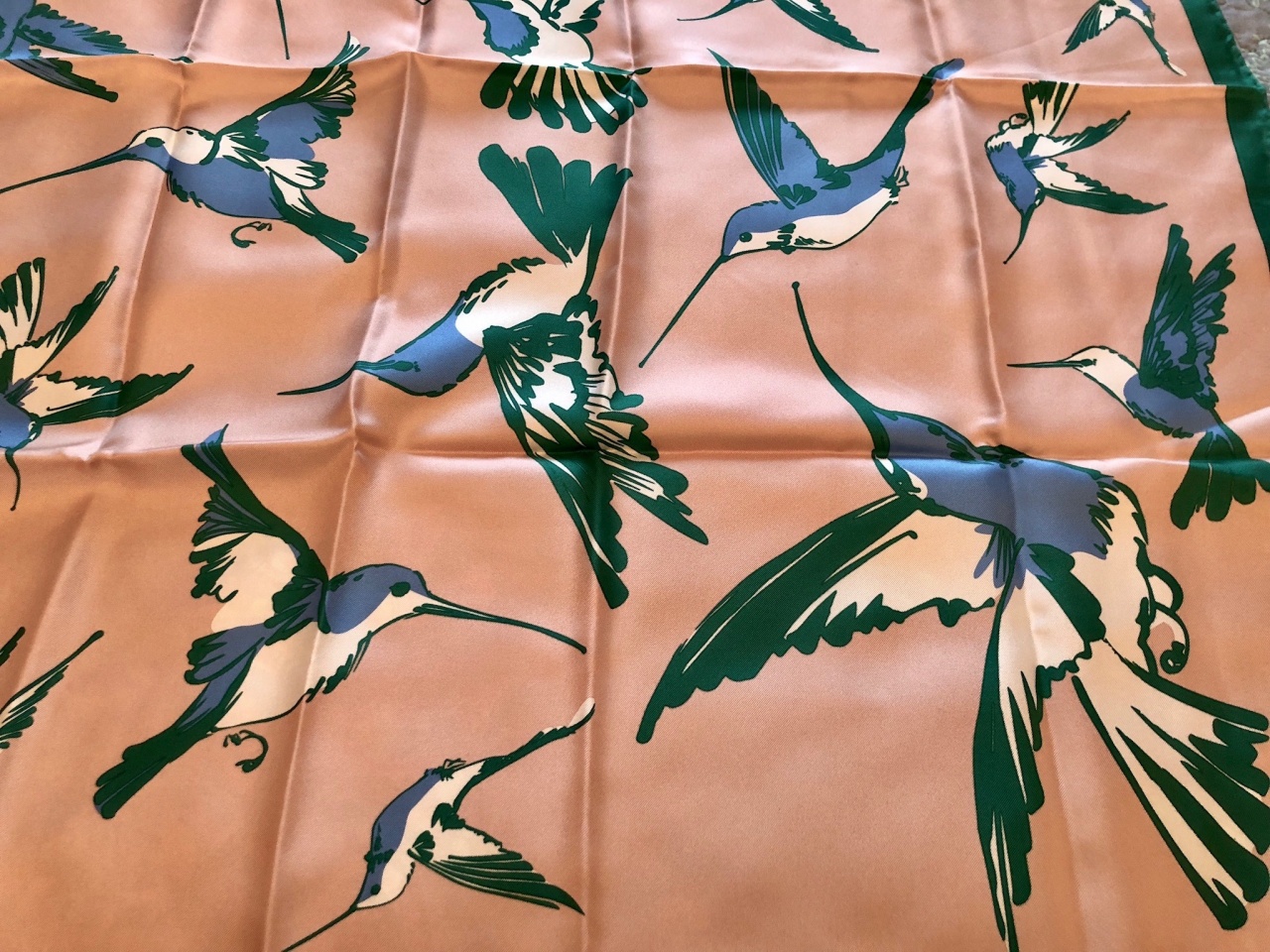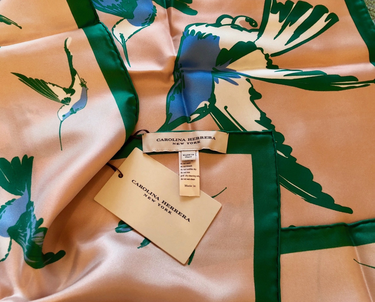 Платок ⭐️ Carolina Herrera ⭐️ Плотный 100% шелк. Цвет: палево-розовый с изумрудно-голубыми колибри