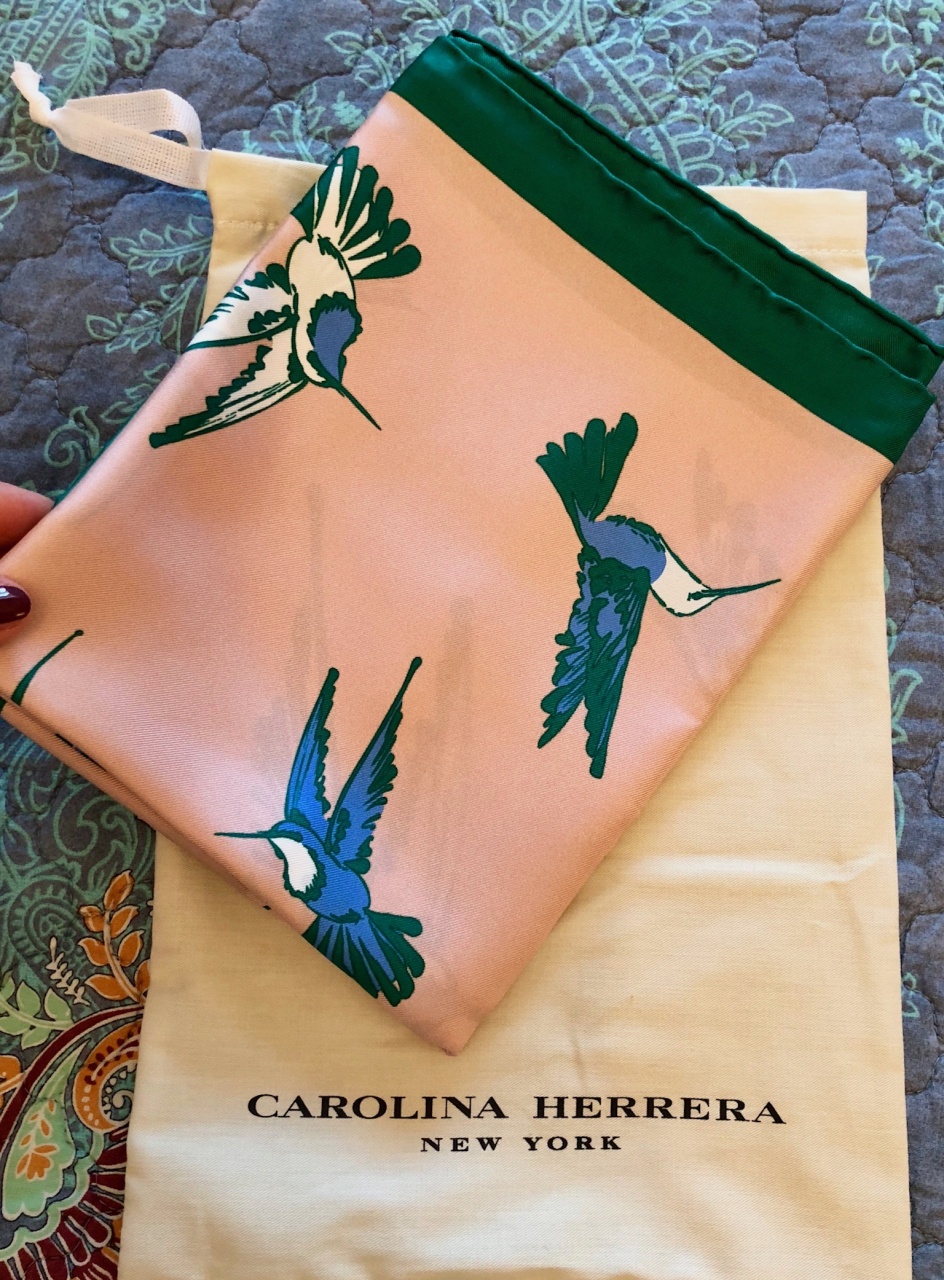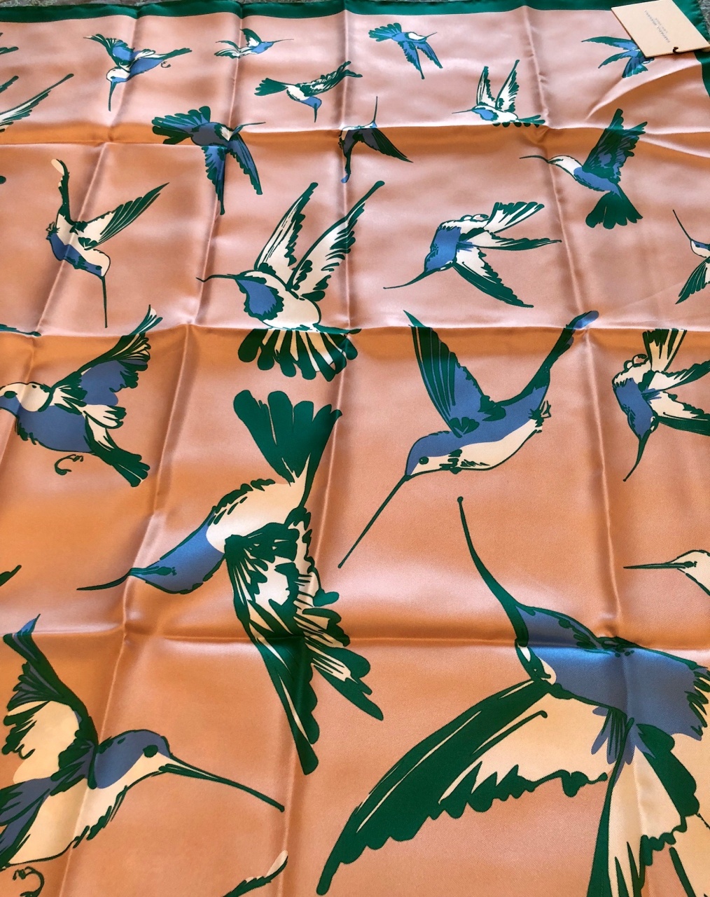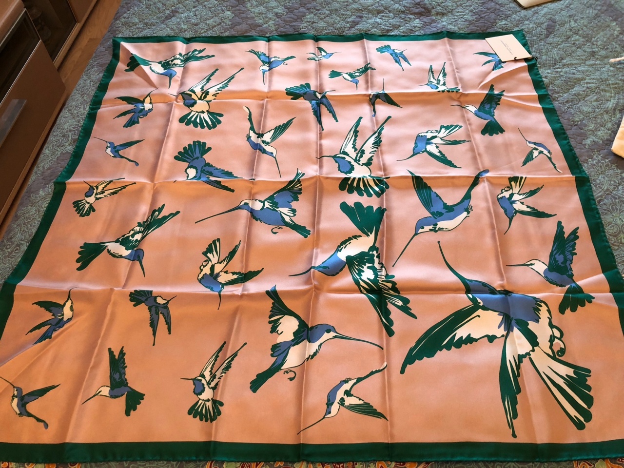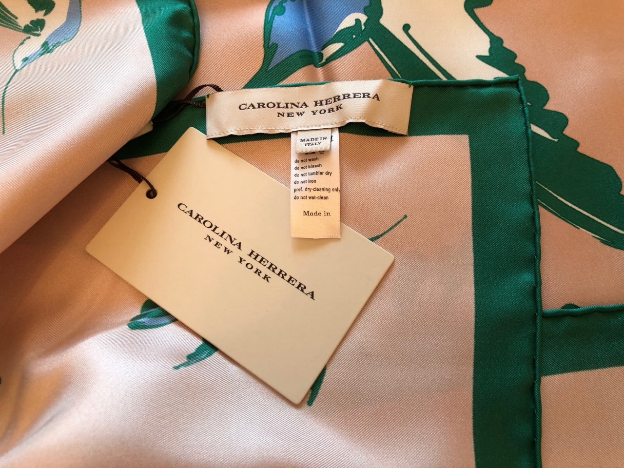 Платок ⭐️ Carolina Herrera ⭐️ Плотный 100% шелк. Цвет: палево-розовый с изумрудно-голубыми колибри