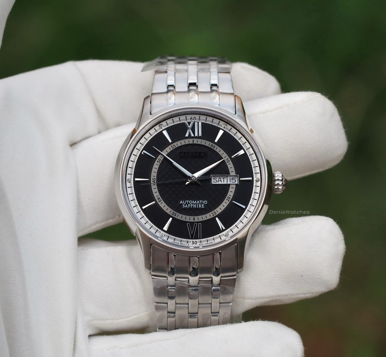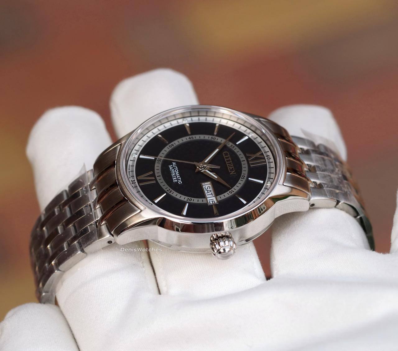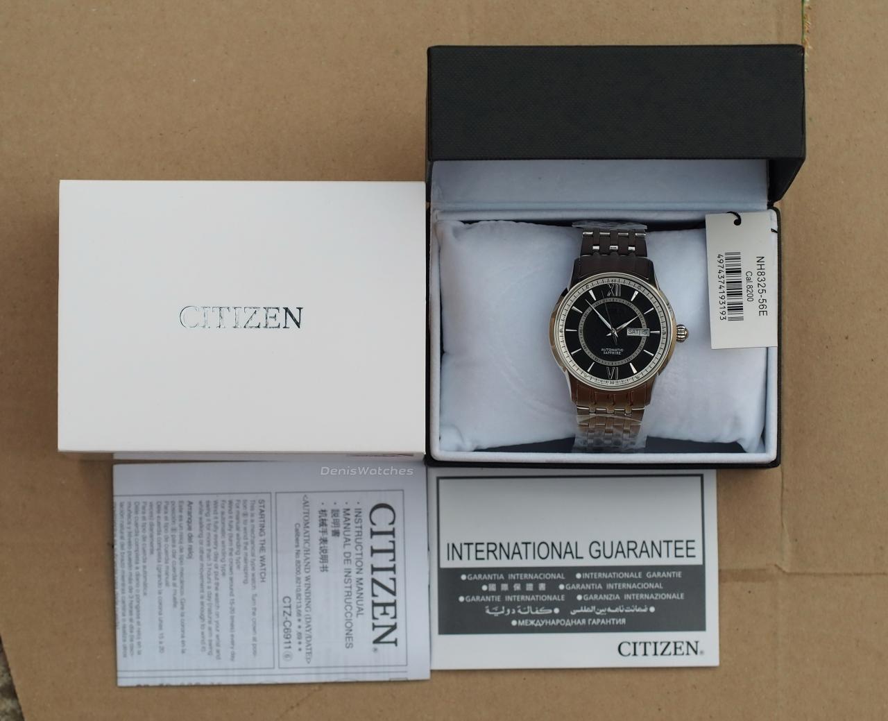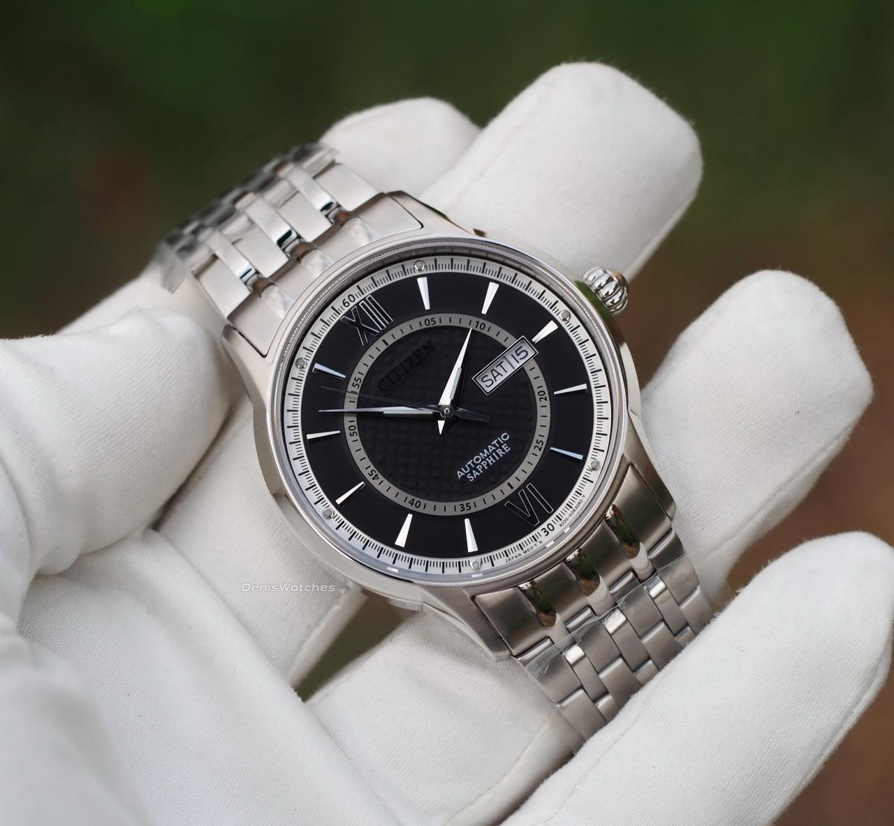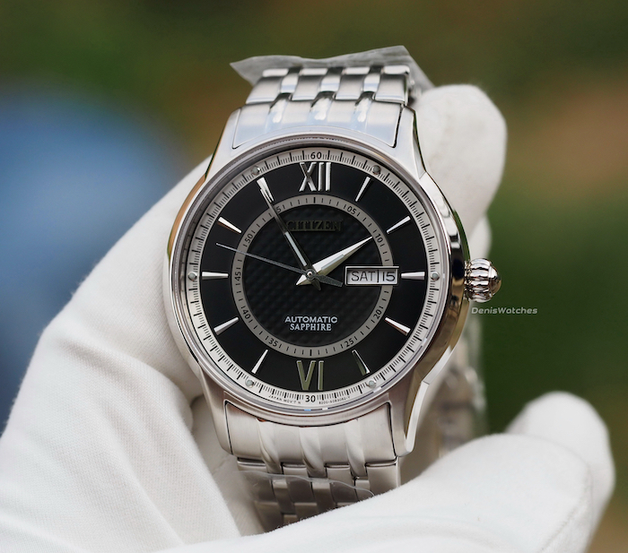 Черный гильёшированный циферблат, накладные металлические метки и лого Citizen