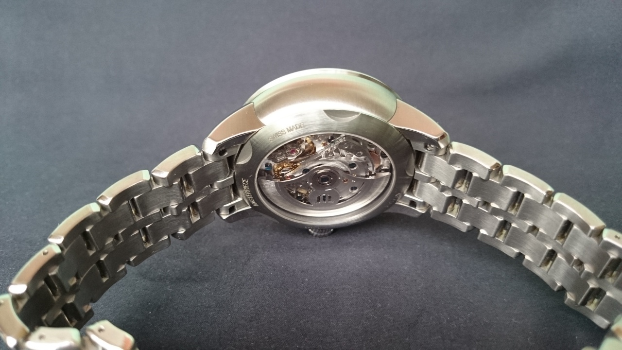 Калибр декорирован, перлаж и женевские волны можно наблюдать через прозрачную заднюю стенку.