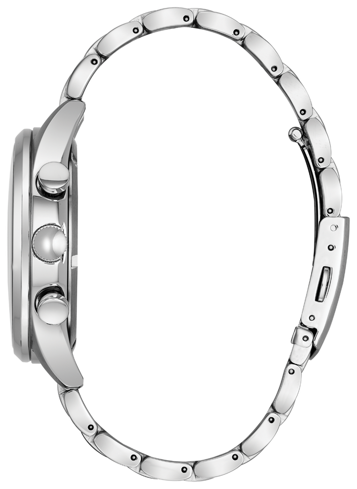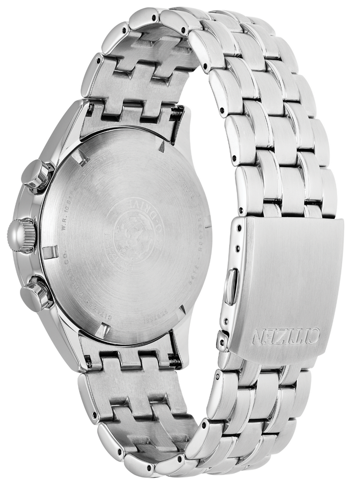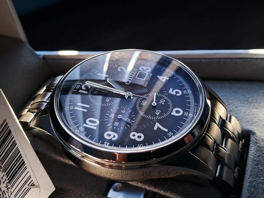 Комфортный размер - 42мм. Очень удобный литой браслет с литыми крайними звеньями. Люминофор на стрелках и метках. Водозащита - 100м. Приятный циферблат с отменной читаемостью. Минеральное стекло. Кварцевый механизм Eco-Drive, часы работают от аккумулятора, подзаряжающегося от света. Хронограф с точностью 1/5 секунды. Плавная стрелка хронографа.