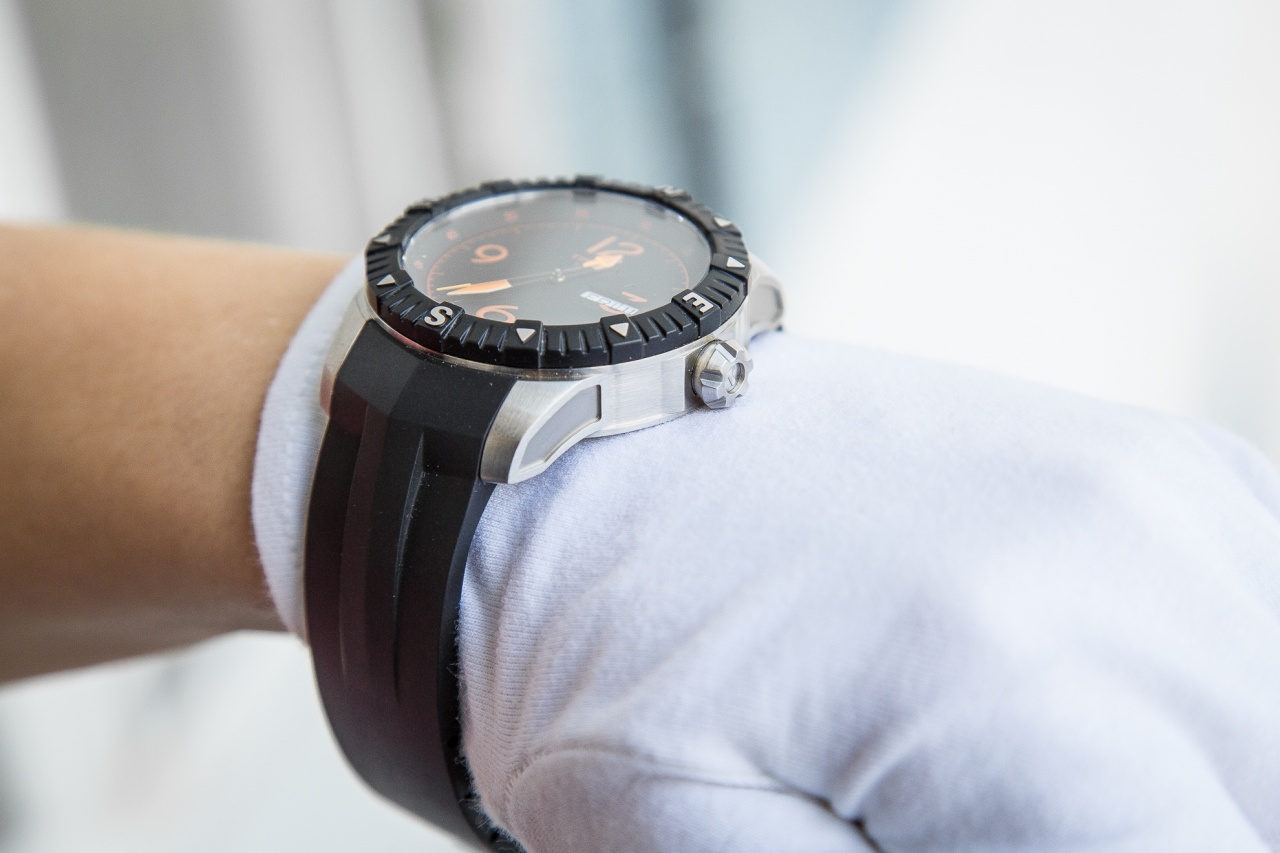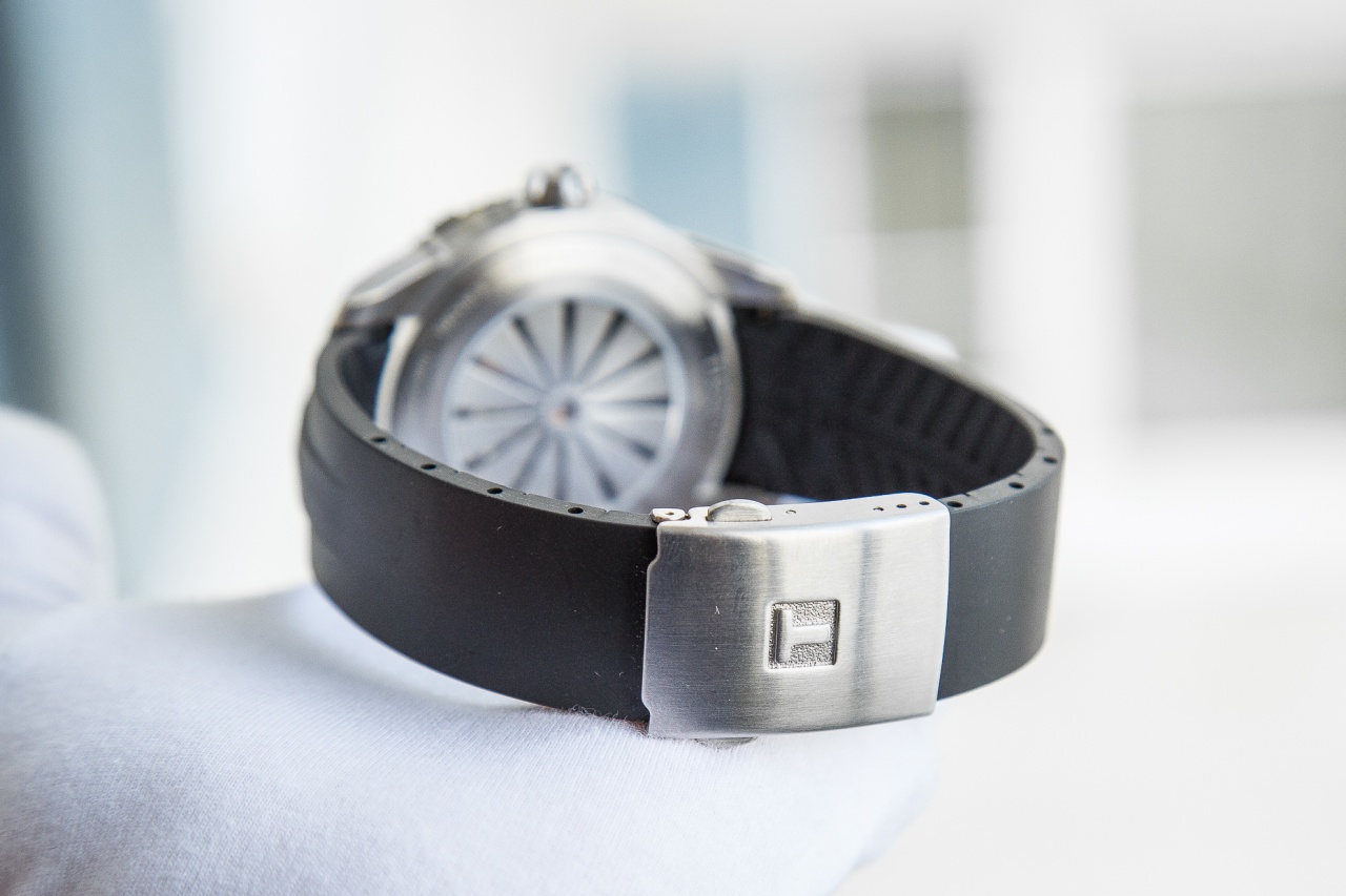 Есть мелкие царапки на застежке, корпусе и заводной головке, заметные при внимательном осмотре. Каучук в идеале.