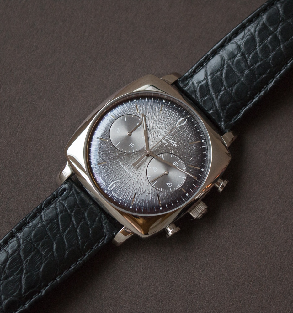 Часы целиком состоят из того, что принято называть «характерными особенностями». Корпус-подушка, выпуклое стекло, высоко поднятое над циферблатом, выпуклый циферблат, изогнутые стрелки, повторяющие рельеф циферблата, типографика в стиле 1960-х годов. Хронограф тоже особенный — он двухсекционный, с гипертрофированными счетчиками.