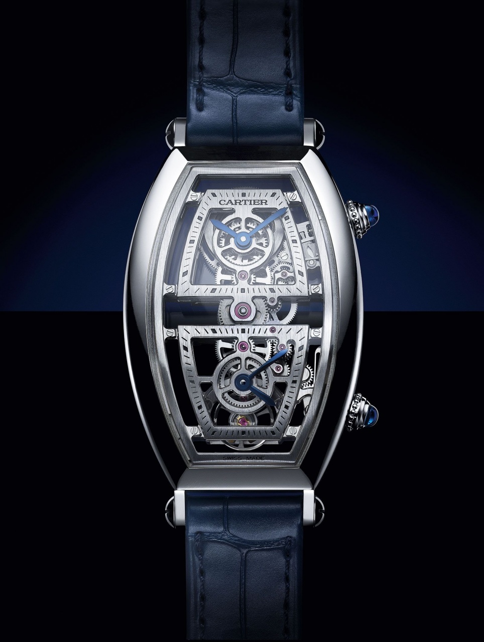Часы Cartier Privé Tonneau Skeleton Dual Time вызывают в памяти модель Tonneau XL с функцией второго часового пояса, которая была выпущена в 2006 году в рамках коллекции Paris de Cartier. За отображение времени в двух часовых зонах в этой модели отвечали два разных механизма. В новинке SIHH 2019 все проще: работу часов обеспечивает один механизм – оснащенный 60-часовым запасом хода калибр 9919 MC, что потребовало от разработчиков расположить колесные передачи линейно (по линии «12 – 6 часов»). У этих часов две заводные головки. Время второго часового пояса настраивается при помощи той, которая расположена у отметки «4 часа». На нее нужно нажать, и стрелка будет продвигаться с шагом в 1 час.