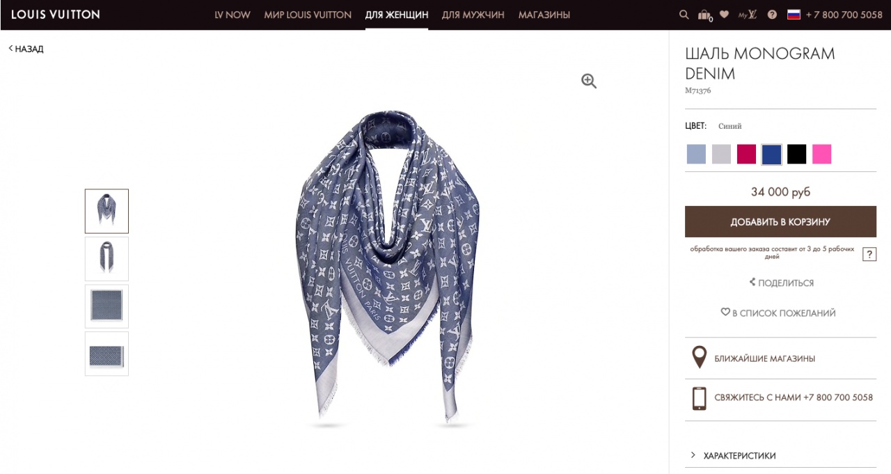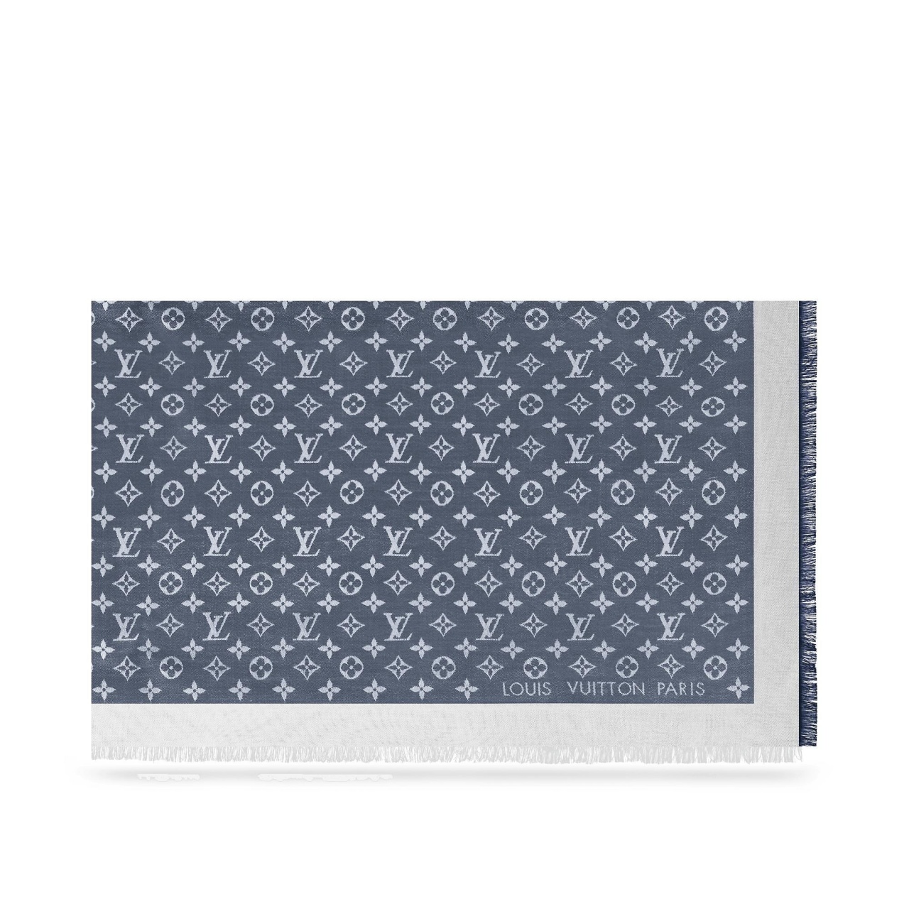 "Роскошная мягкая шаль Monogram Denim, воплощение изящества и женственности, станет незаменимым аксессуаром на каждый день. Рисунок Monogram, заполняющий всю поверхность шали, дополнен надписью Louis Vuitton."