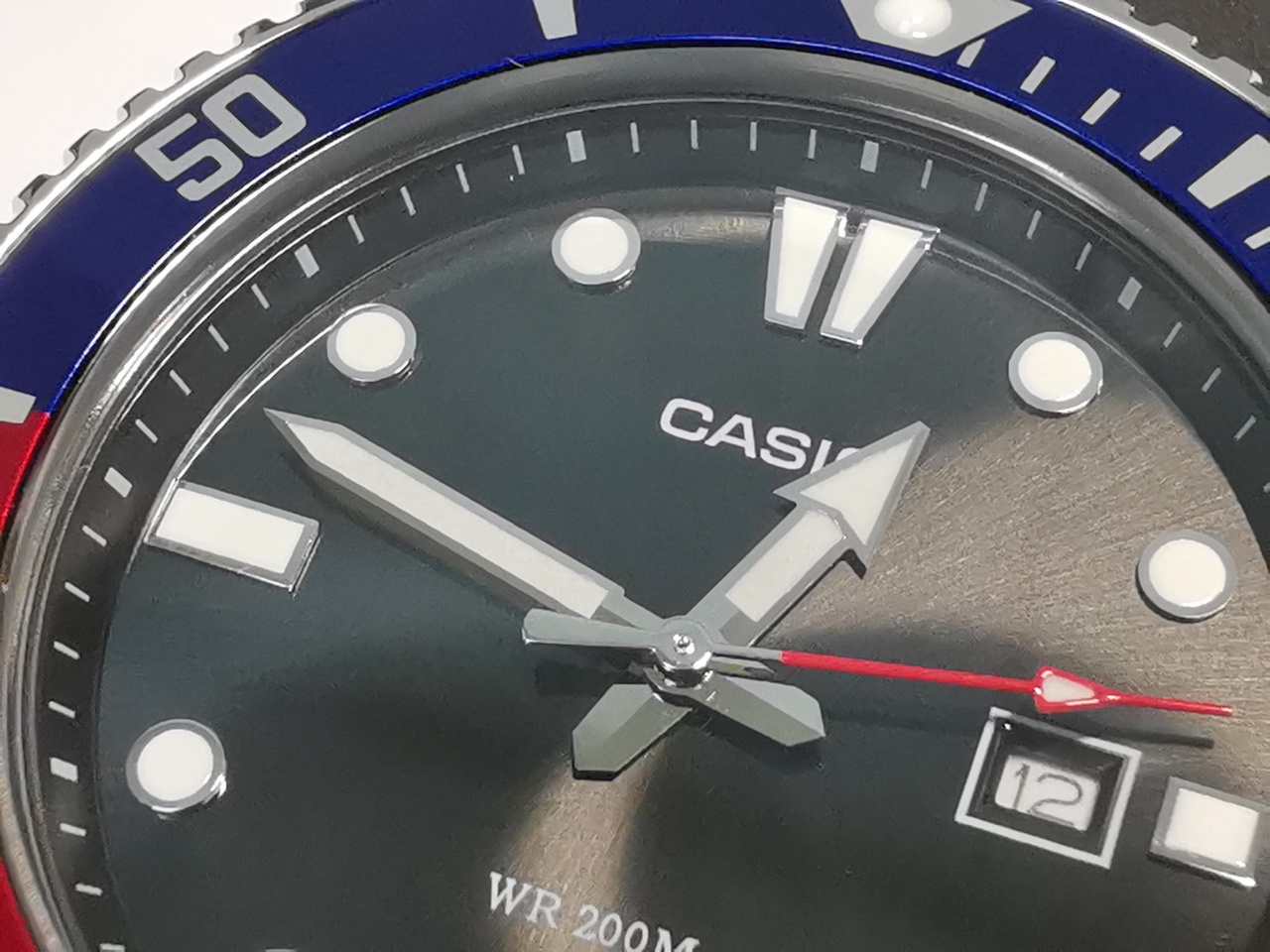 Стекло над циферблатом плоское, минеральное. Циферблат черного цвета, имеет шелковое сатинирование от центра, благодаря которому достигаются приятные шелковые переливы. Часовые метки накладные, исполнены в виде круглых, прямоугольных и призматических оправок серебристого цвета, заподлицо заполненных люминофором.(Если бы заполнили с горочкой, то и смотрелось бы лучше, и светило бы дольше) Окошко даты прямоугольное, оформленное серебристой рамкой. Надписи на циферблате: Casio, wr 200m, japan mov't., - выполнены белой краской довольно аккуратно. Минутная шкала по периметру циферблата выполнена в виде редких черточек белой краской. Стрелки хромированные, мечевидные, двухгранные, заполнены люминофором в основной своей части. Заводная головка завинчивающаяся на резьбе, цилиндрическая, полированная, с фрезерованными довольно крупными зубцами. Верхушка головки слегка выступающая, без логотипа.