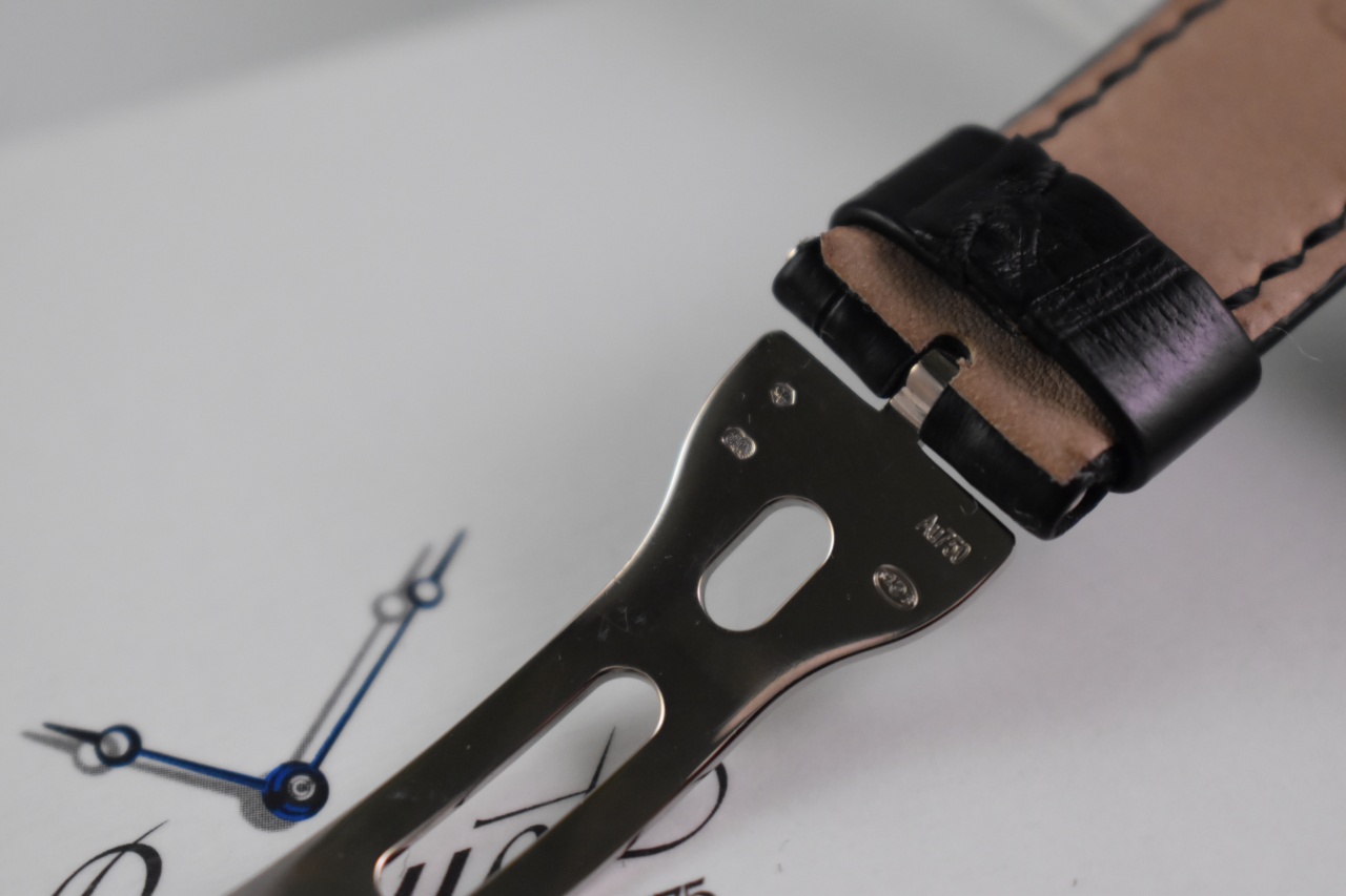 Ремешок, изготовленный из кожи аллигатора с раскладывающейся застежкой из золота, выполнен в строгом стиле и воплощает элегантность.