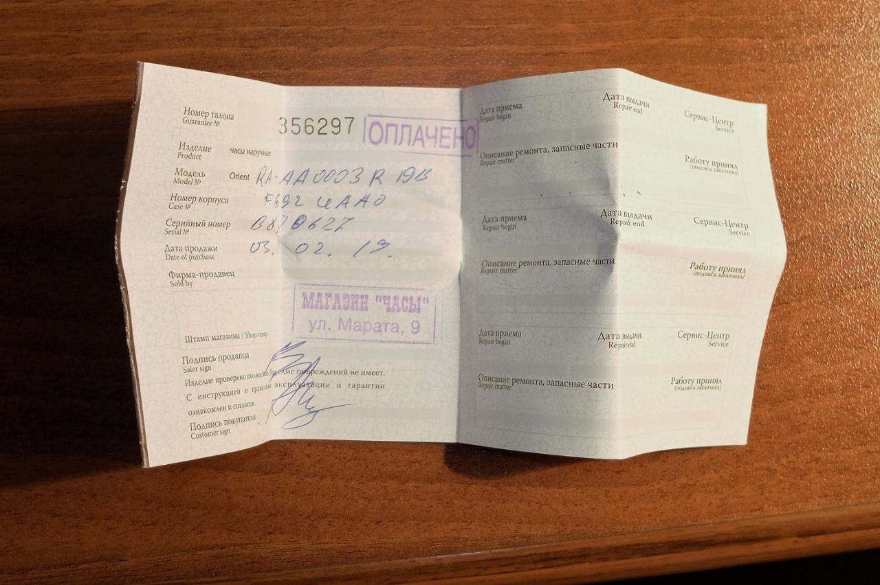 Полный комплект- коробка, документы и 2- летняя фирменная гарантия. Часы покупались у официального дилера компании Orient в России, поэтому проблем с гарантийным и сервисным обслуживанием не будет.