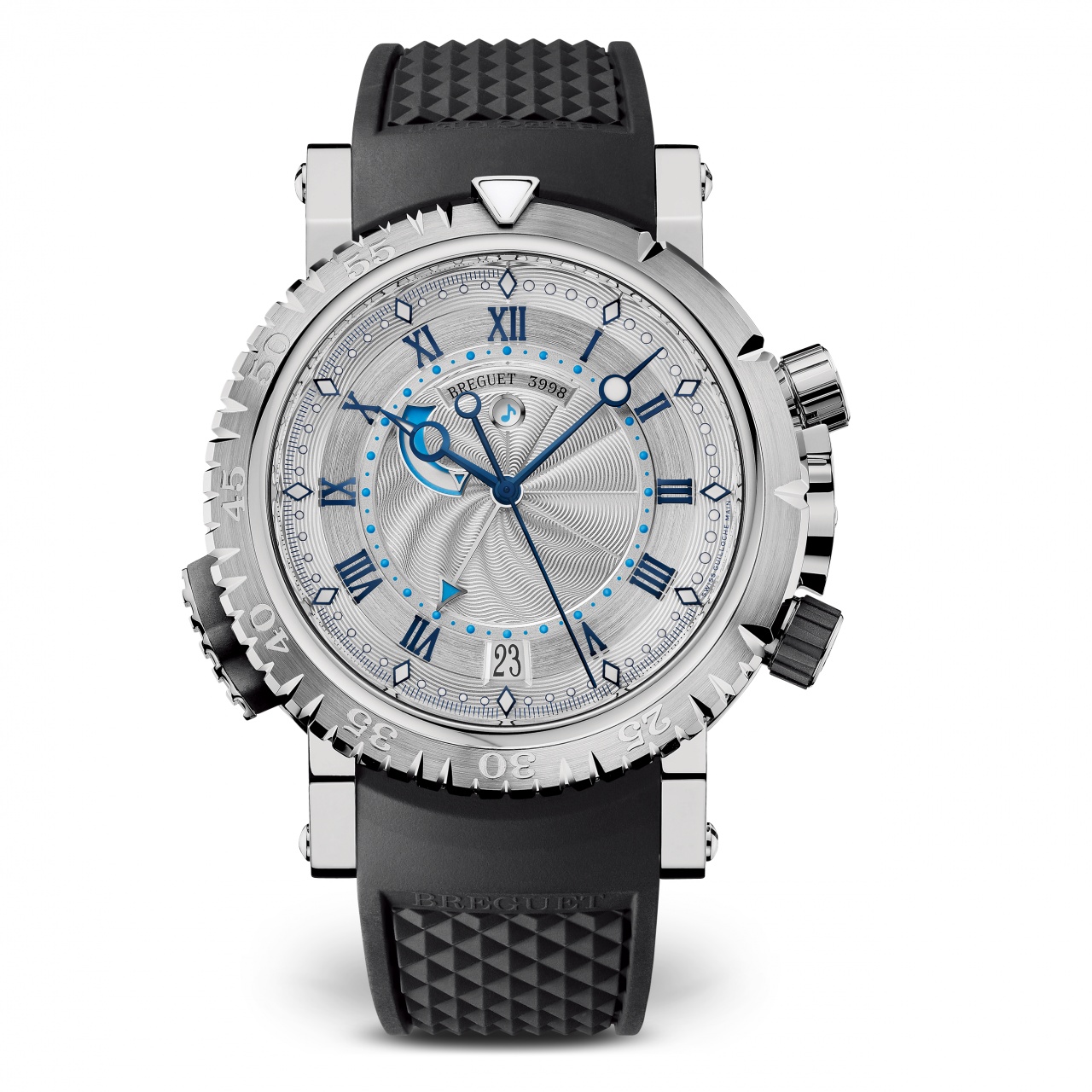 Breguet Marine Royale White Gold 5847BB/12/5zv - это истинно королевское пополнение «морской» коллекции от Бреге. Дайверская модель Breguet 5847BB с водонепроницаемостью до 300 метров оснащена будильником, установка времени на котором производится коронкой на отметке «4 часа» и отмечается треугольной стрелкой на малом циферблате. За включение/выключение сигнала отвечает кнопка на «8 часов», функция отражается на круглом индикаторе в положении «12 часов». Индикатор запаса мощности будильника - на отметке «10 часов». Корпус часов Breguet Marine Royale 5847BB-12-5zv, диаметром 45 мм, гравированный вручную циферблат, безель, вращающийся в одну сторону, завинчивающиеся заводные головки и кнопка с каучуковым покрытием выполнены из белого золота 18-ти карат.