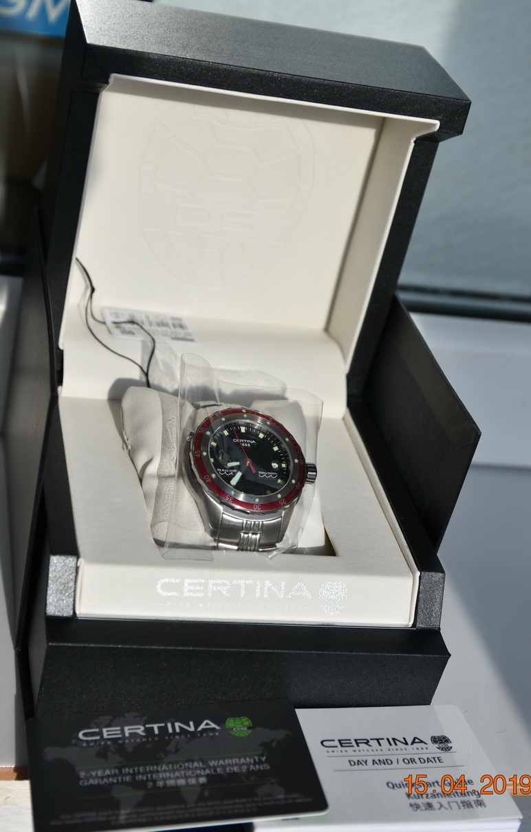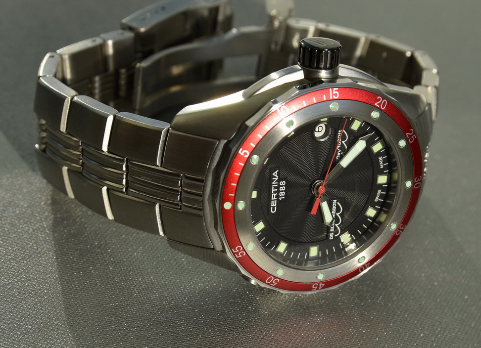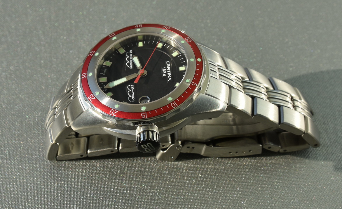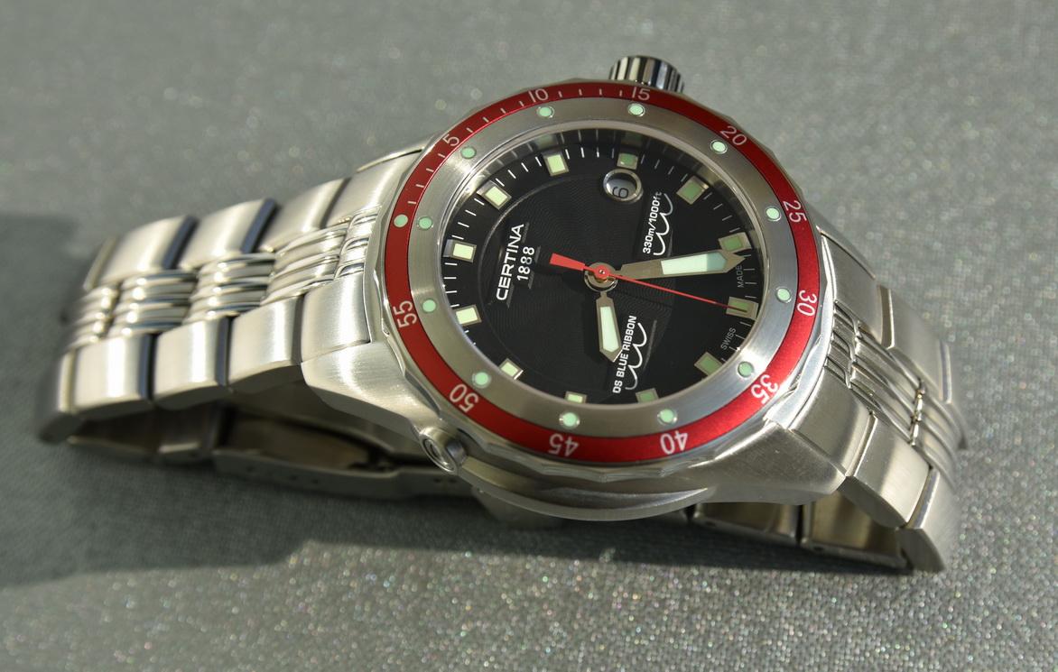 Модель Blue Ribbon с красным безелем идет только на каучуковом ремне. В данном случае на часы с красным безелем (модель C007-410-17-051-00), которые не были в носке ни дня был установлен браслет от модели-хронографа с синим безелем (C007.417.11.041.00). Браслет использовался около недели и имеет лишь несколько еле заметных "волосков" на застежке.