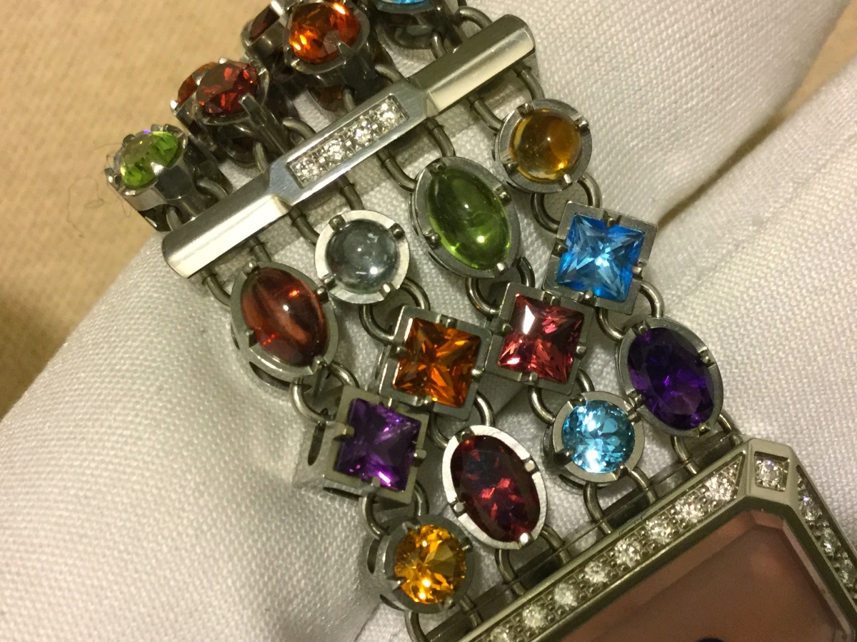 - браслет инкрустирован голубыми сапфирами, гранатами, цитринами, перидотами и другими камнями (8-10 вариаций цветов камней разной огранки)