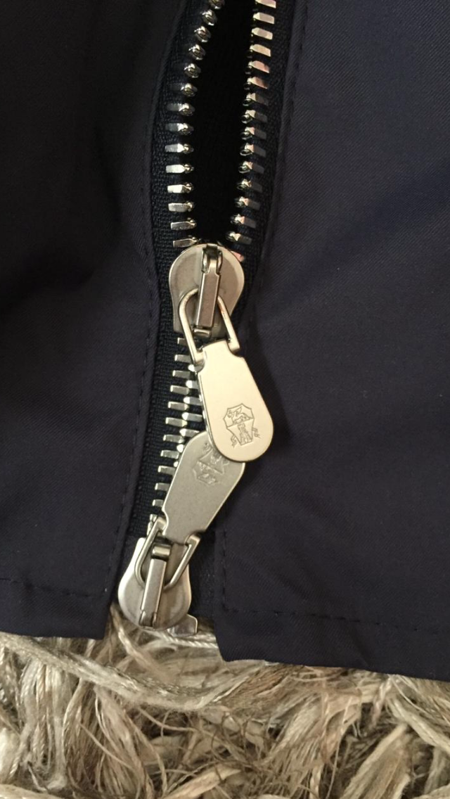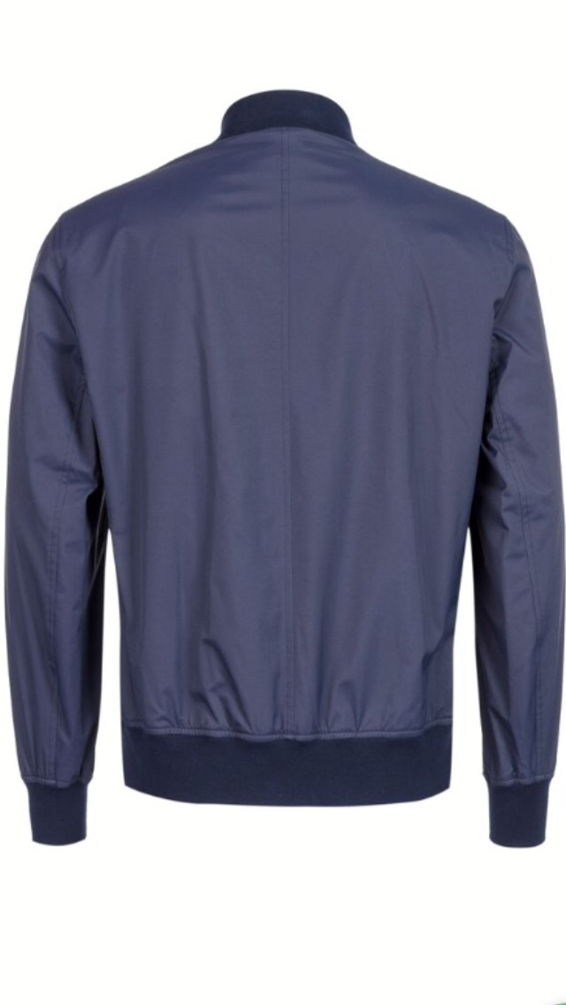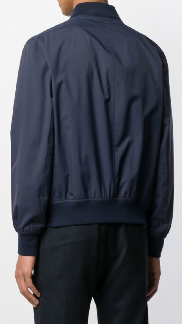 Бомбер выполнен из современной водонепроницаемой нейлоновой ткани насыщенного тёмно-синего цвета.Традиционный фирменный крой Brunello Cucinelli (прямой силуэт,невысокий воротник-стойка,длинные рукава) придаёт модели изысканный характер и элегантность.Куртка застёгивается на прочную металлическую молнию с двумя крупными брендированными бегунками контрастного серебристого цвета.Прорезные карманы по бокам также имеют застёжку на молнию.Нижняя кромка,манжеты втачных рукавов обрамлены хлопковой трикотажной резинкой в тон изделию.Бежевая подкладка с фирменными нашивками бренда,внутренние карманы с застёжкой на пуговицу с названием знаменитой марки.