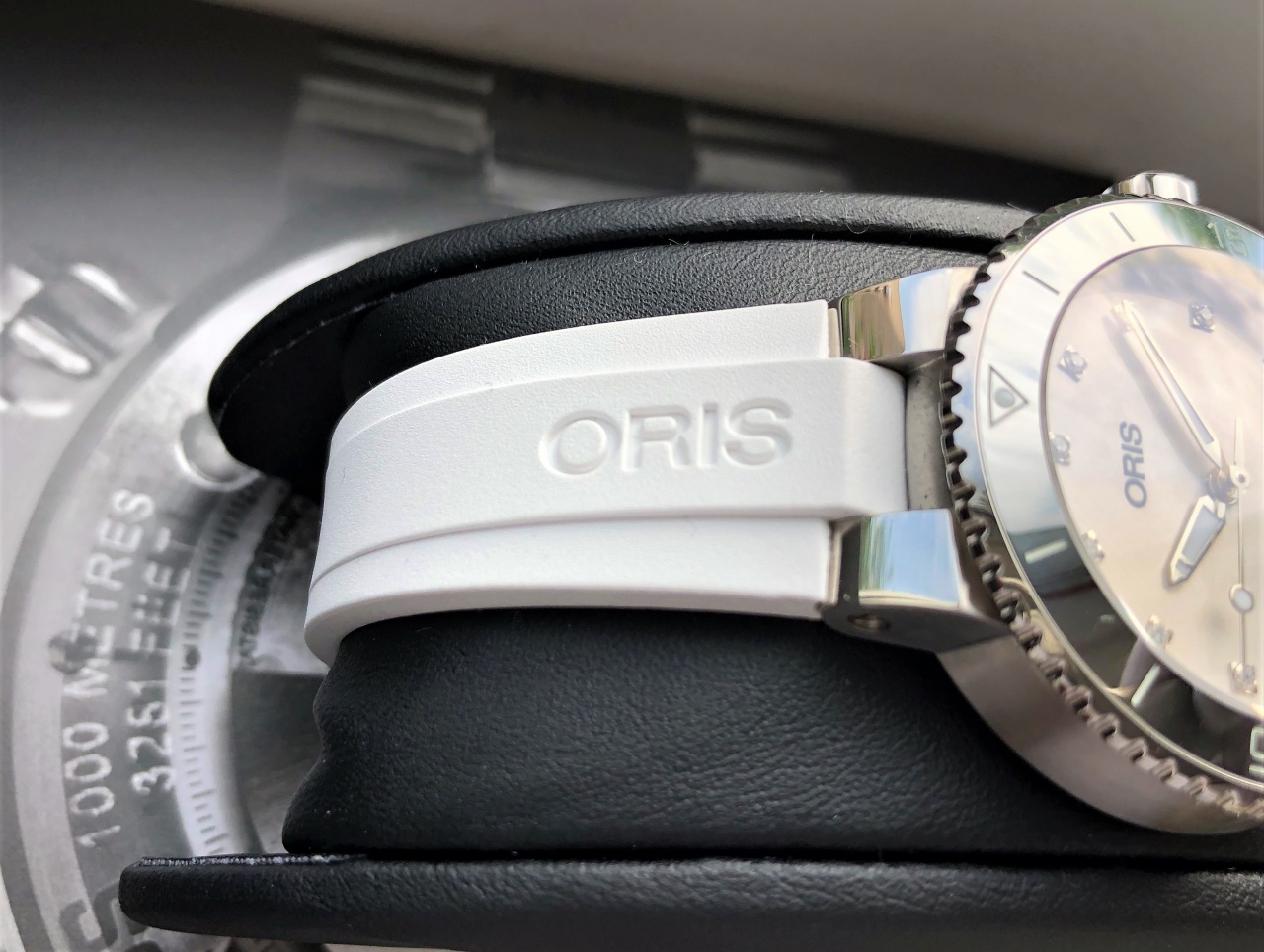 Часы имеют выпуклое сапфировое стекло, циферблат кремового цвета с эффектом sun burst,
