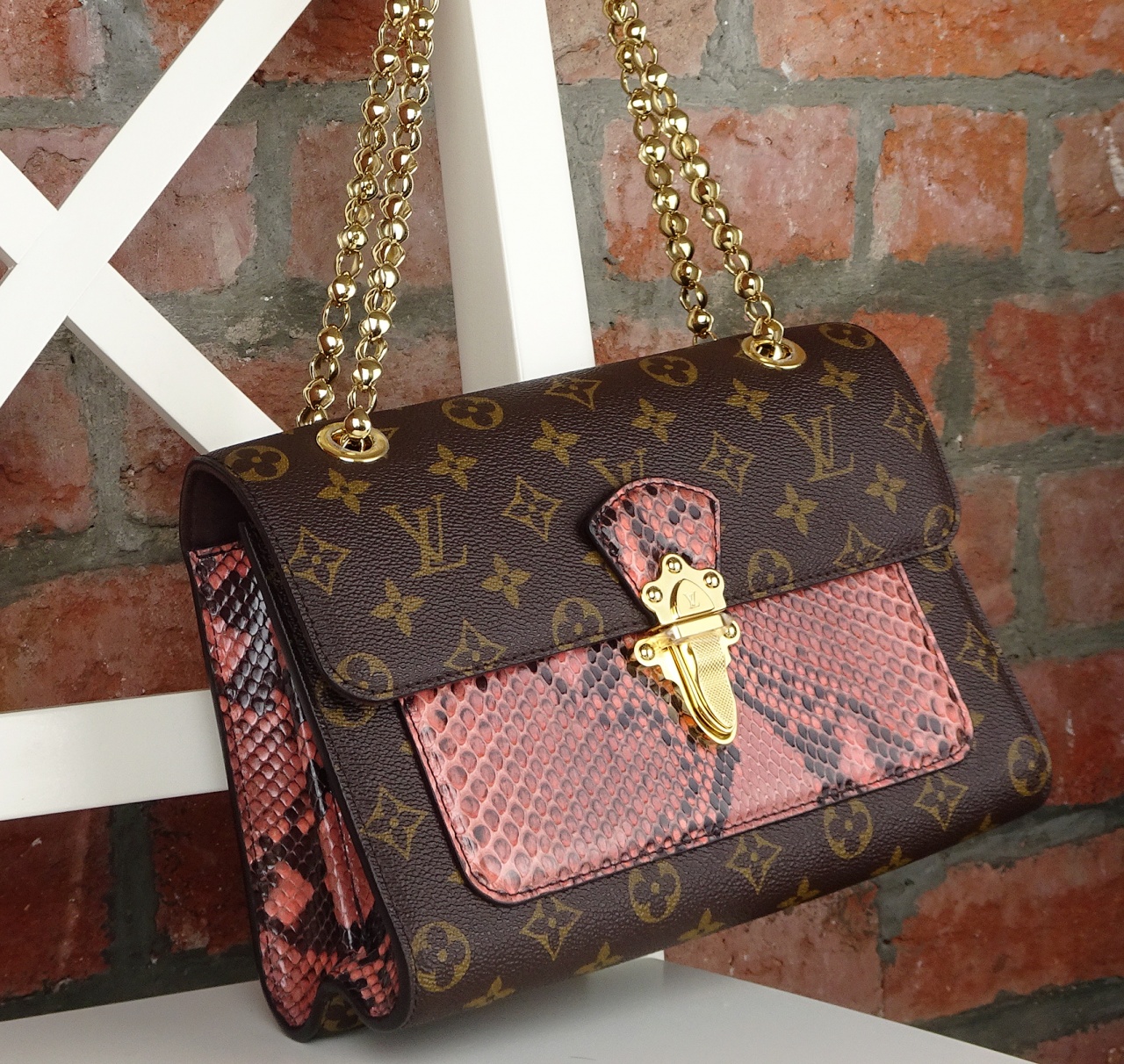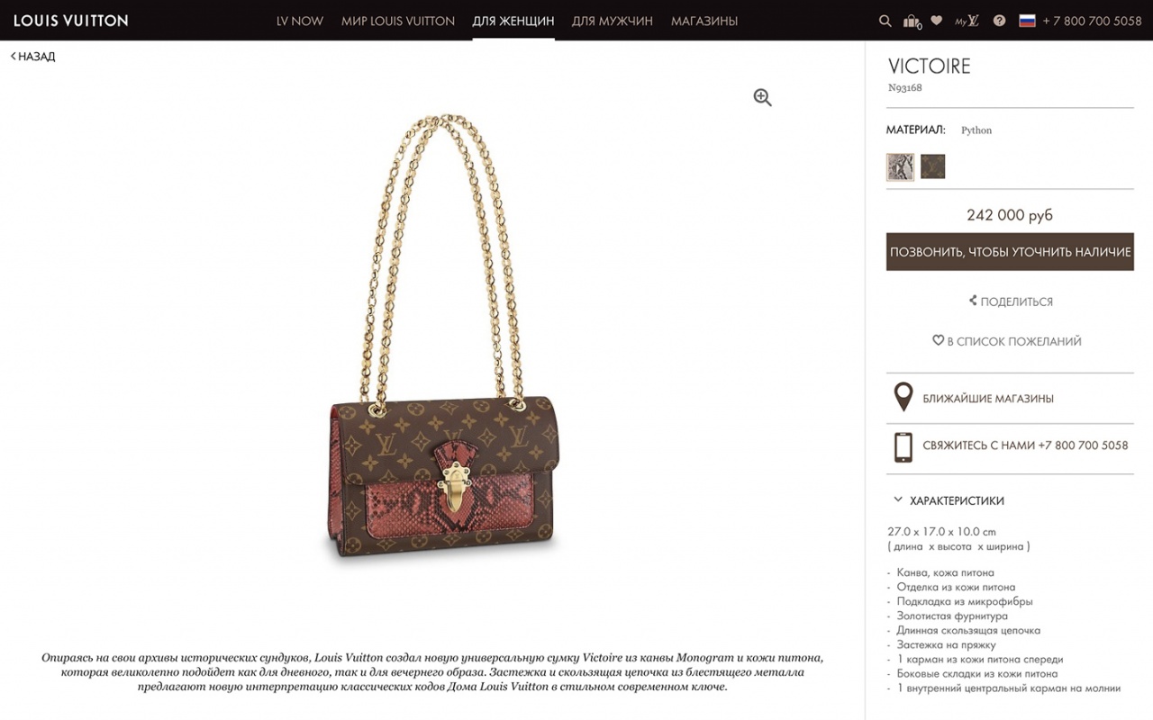"Опираясь на свои архивы исторических сундуков, Louis Vuitton создал новую универсальную сумку Victoire из канвы Monogram и кожи питона, которая великолепно подойдет как для дневного, так и для вечернего образа. Застежка и скользящая цепочка из блестящего металла предлагают новую интерпретацию классических кодов Дома Louis Vuitton в стильном современном ключе.