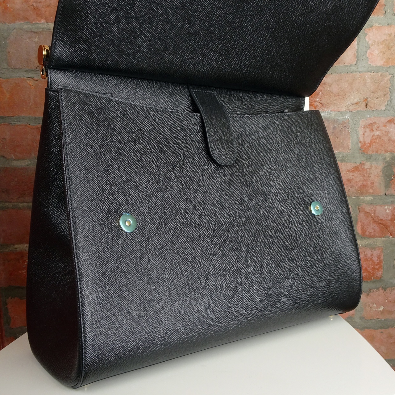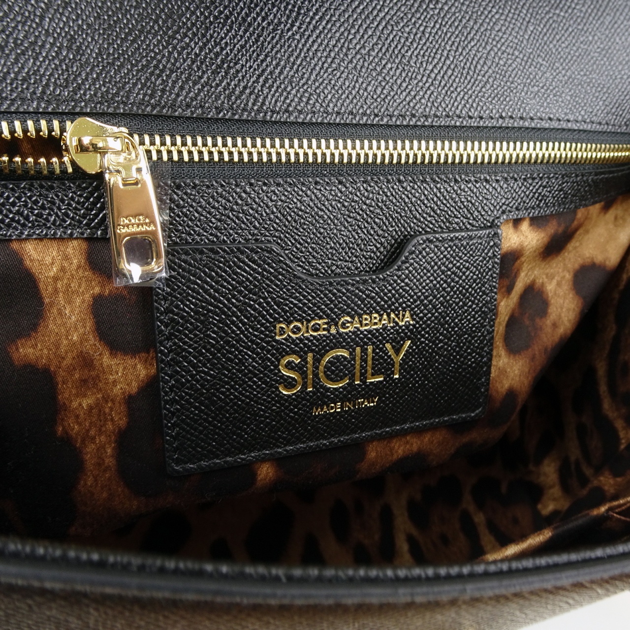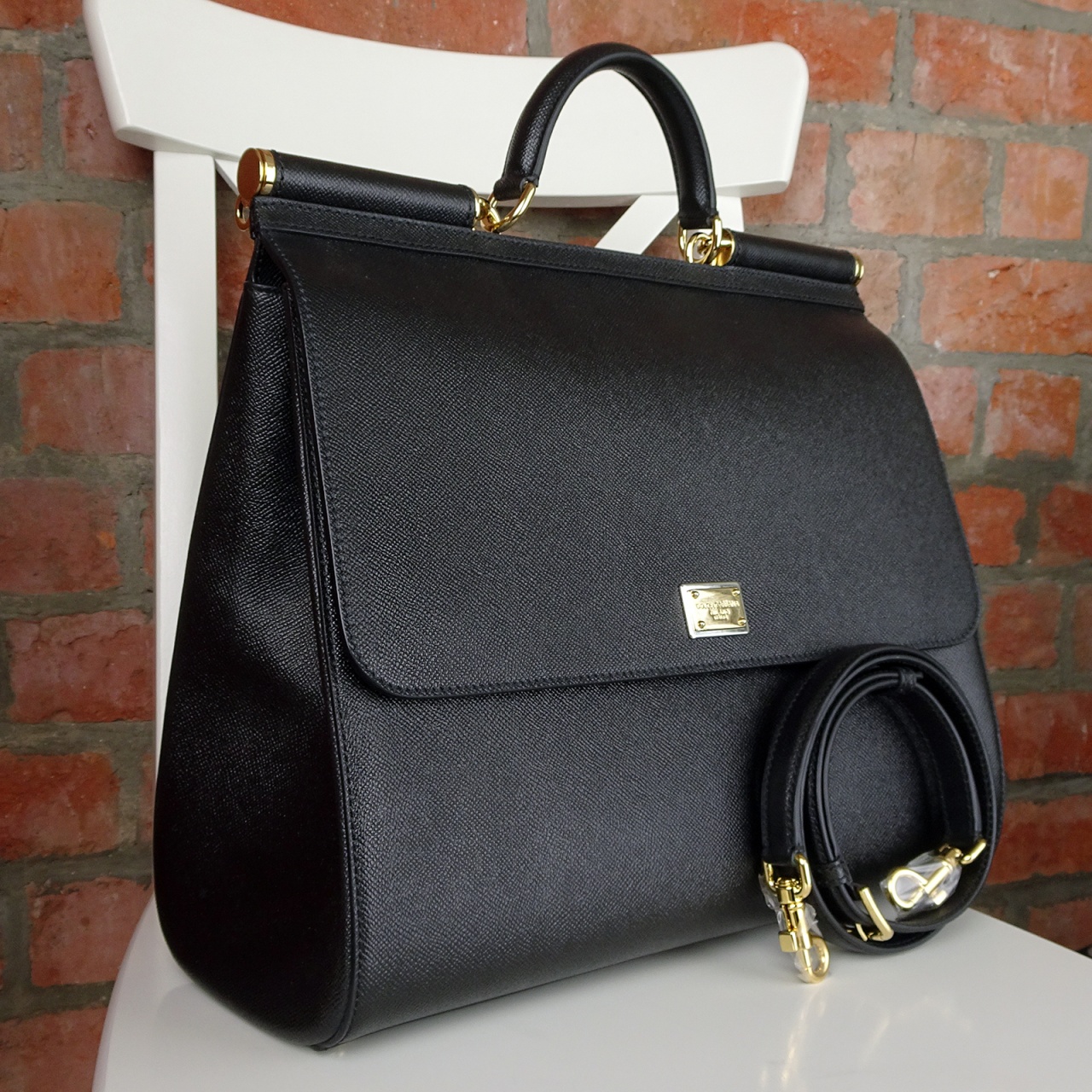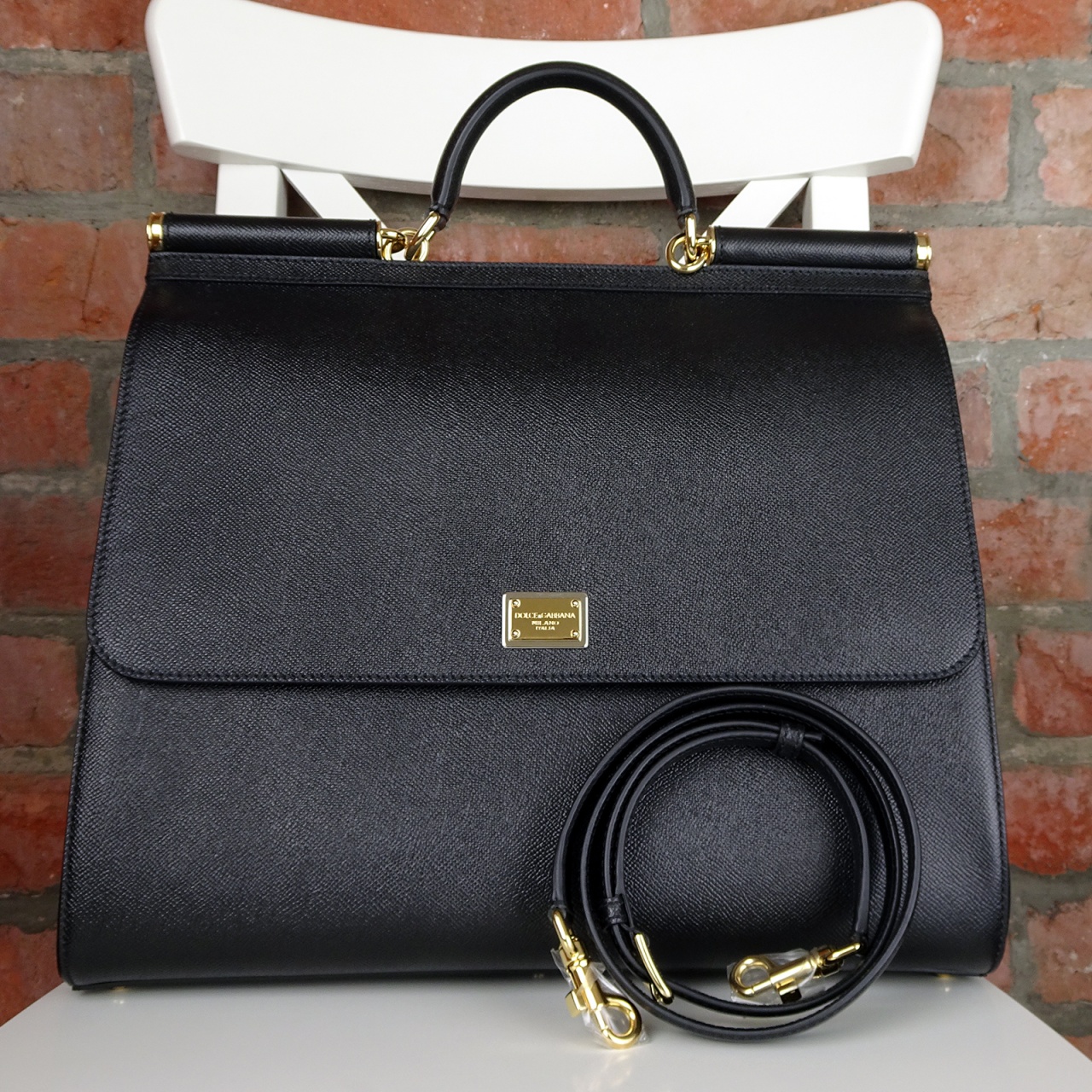 Знаменитый узнаваемый внешний вид, классическая кожа Dauphine, золотистая фурнитура, удобная ручка сверху, съемный плечевой ремень - это та самая сумка Sicily, самая востребованная модель-бестселлер Dolce & Gabbana. Но в редкой версии! Особенность данной версии этой культовой модели: сумка имеет увеличенный размер, вмещающий документы А4!