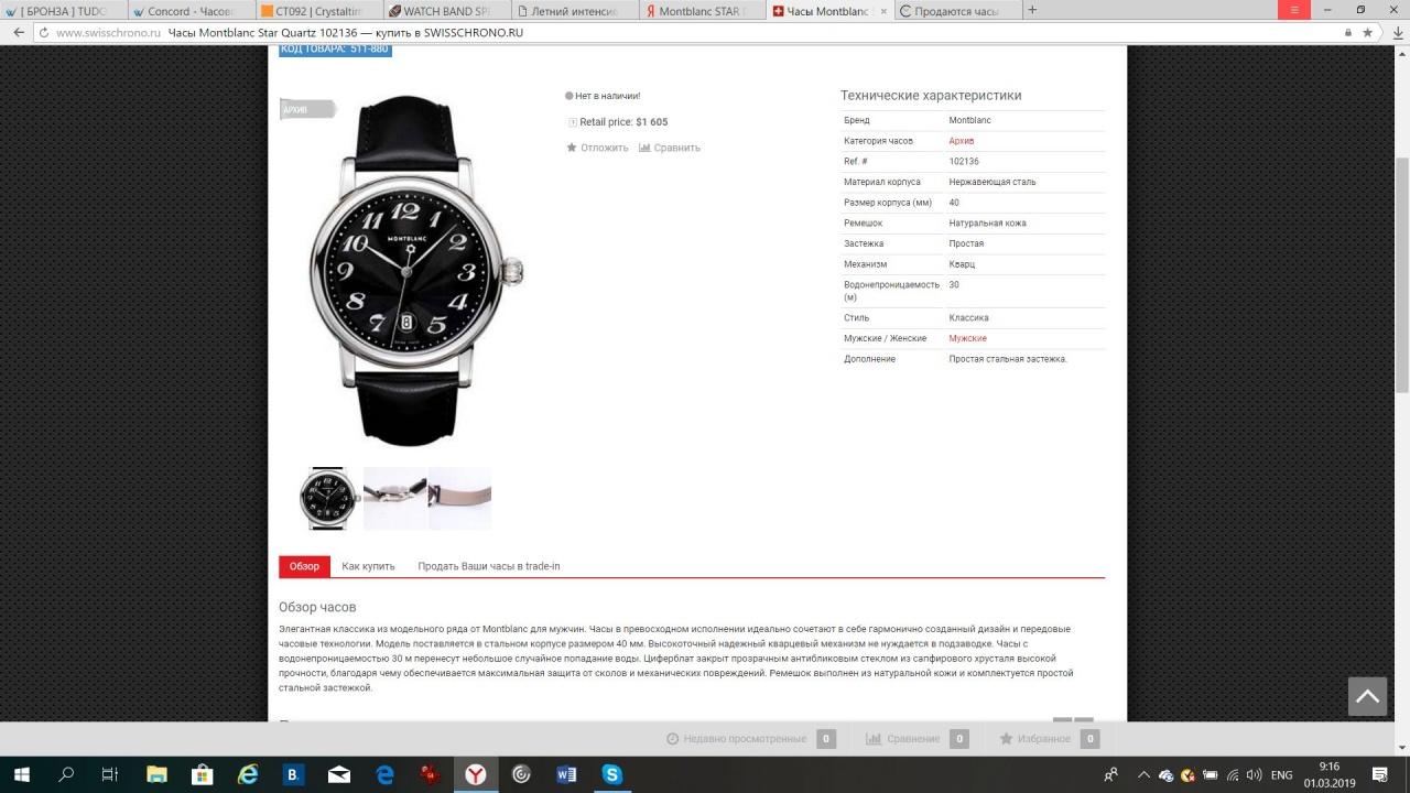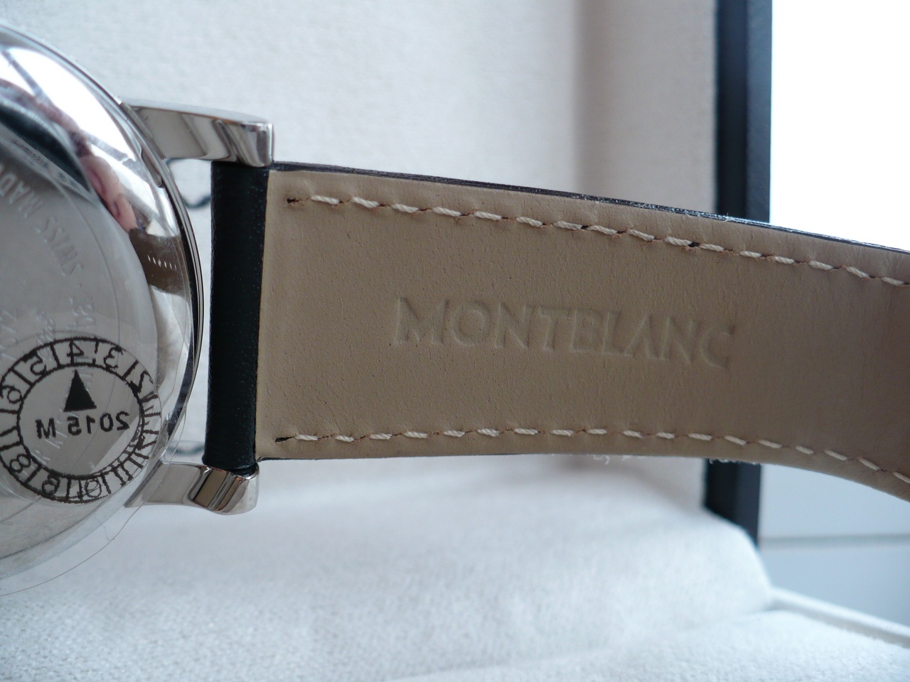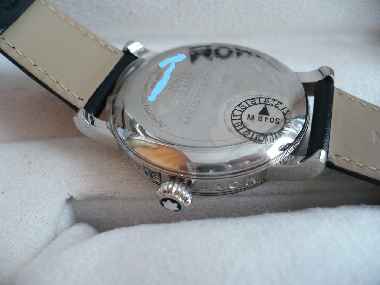 Стекло сапфир, немного куполообразное. Корпус толщина 12мм, сталь полированная, на боковых торцах крупные гравировки "montblanс" и "MEISTERSTUCK". Ремешок гладкая натуральная кожа посадочный размер 21мм, бакля массивная полированная сталь с логотипом. На заводной головке эмалевая фирменная звезда.