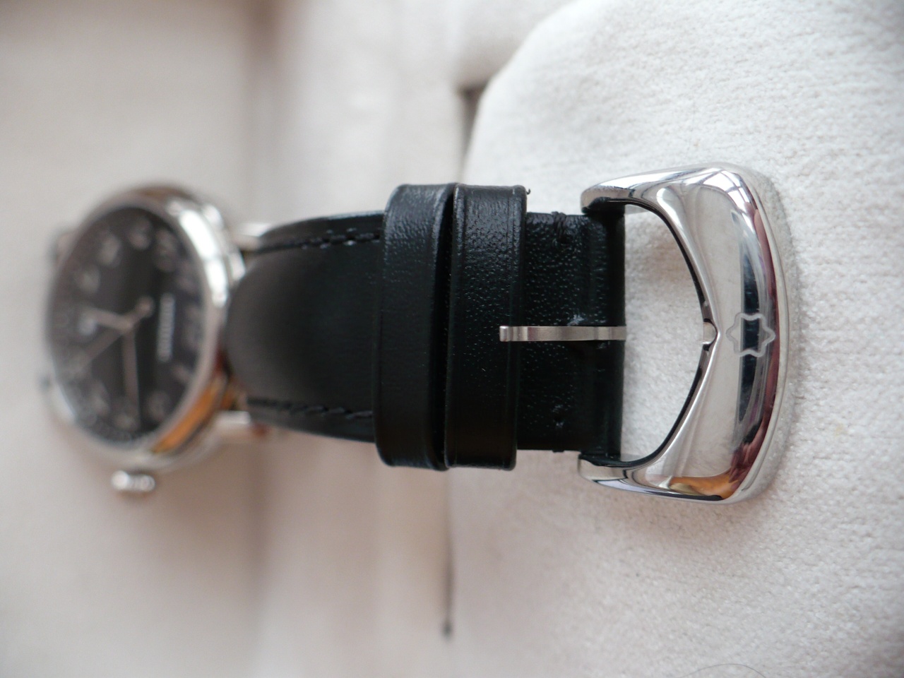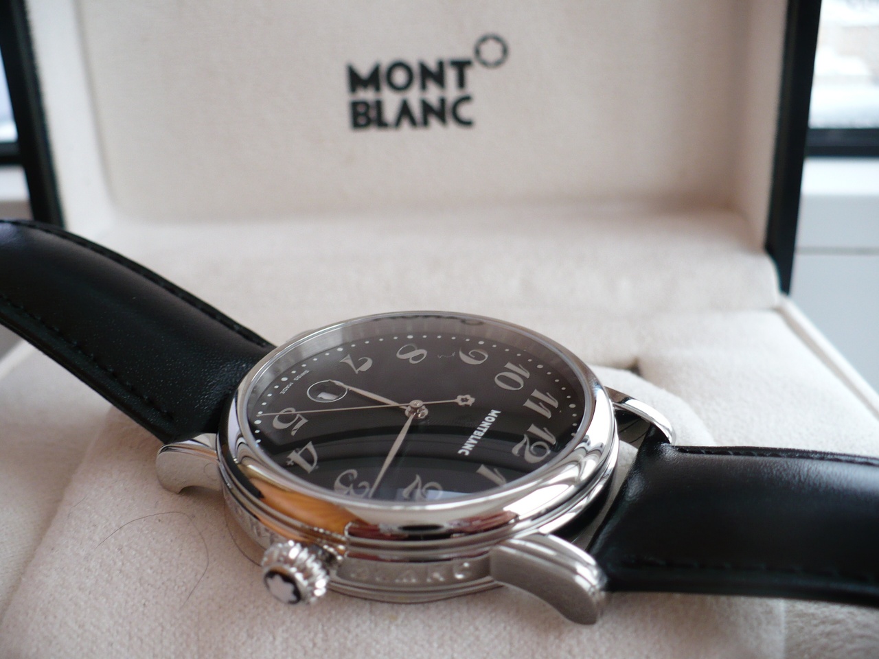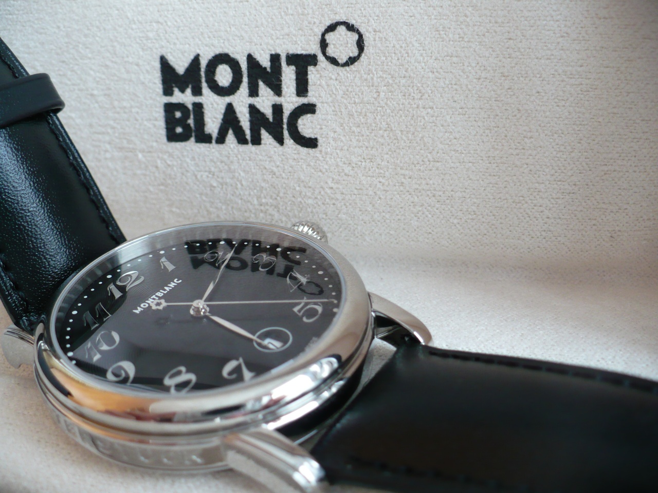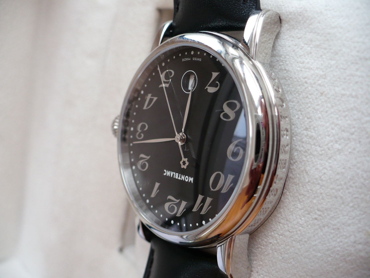 Здравствуйте дорогие друзья! В продаже новые не ношенные (еще в пленках) часы Montblanc Star PL778070 классического костюмного стиля. Циферблат черный с интересным гильоше в форме звезды. Арабские цифры-метки полированные накладные. Интересная секундная стрелка с "летящим" логотипом Монблан. Стрелки полированные, острые и длинные, читаемость циферблата прекрасная. Элегантное круглое окошечко даты на 6ти часах. Часы 2013года, подарочные, на задней крышке подарочная гравировка, что собственно и является и "косяком", и причиной продажи дешево, и не в разделе новых часов. Ретейл на эту модель составлял $1600... Есть коробка и буклет.