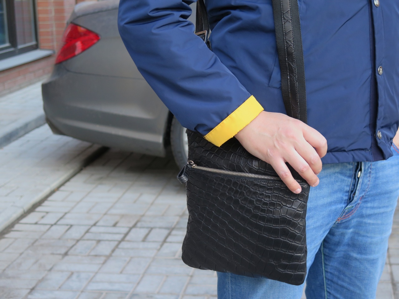 Сумка застёгивается на металлические молнии с бегунками из кожи крокодила, и имеет снаружи внешнее отделение для переноски небольших документов, сотовых телефонов, ключей.