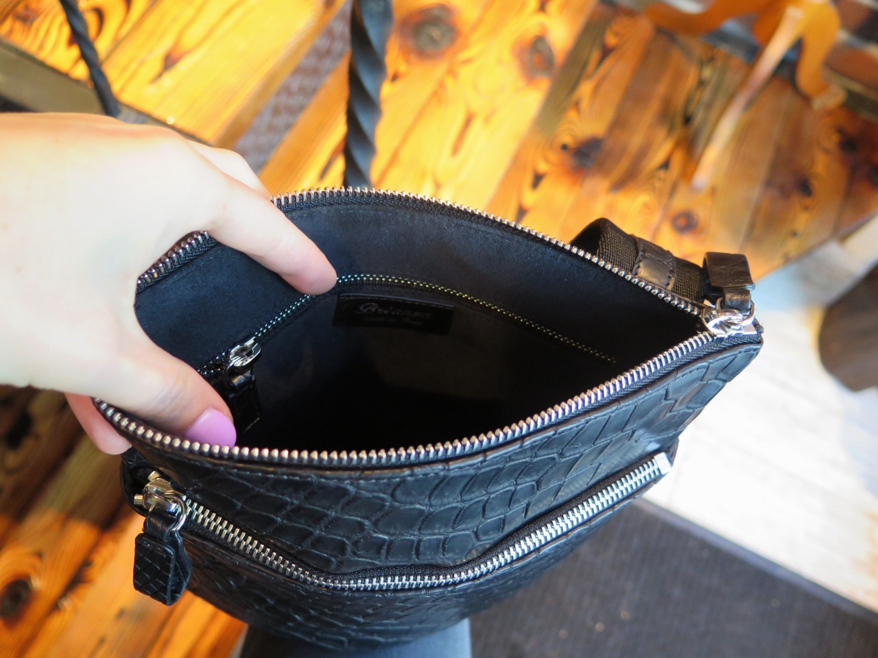 Внутри сумка изготовлена из мелковорсистой замши чёрного цвета с отделкой из кожи крокодила, и имеет одно большое отделение для переноски документов и прочих вещей, и дополнительное отделение на молнии.