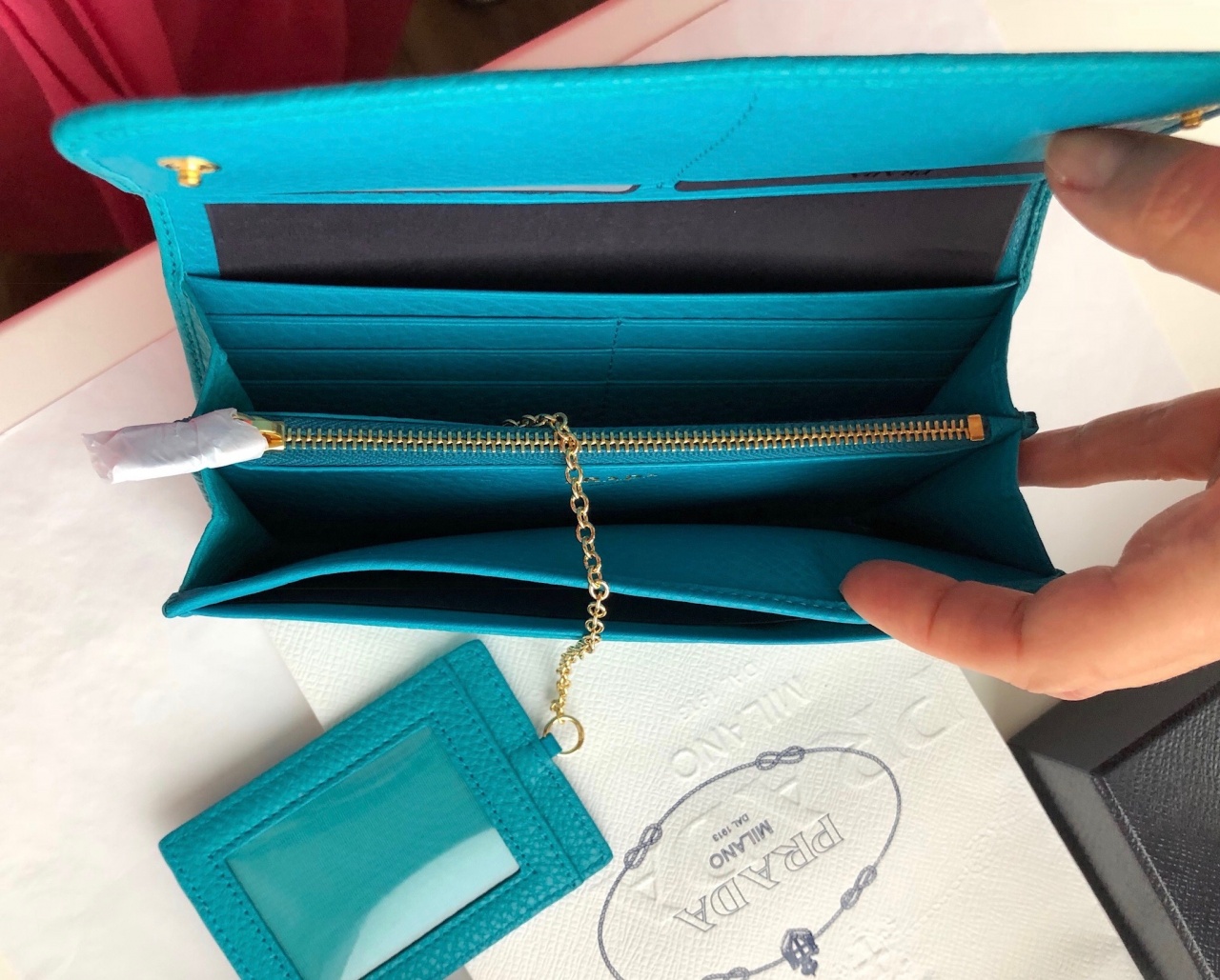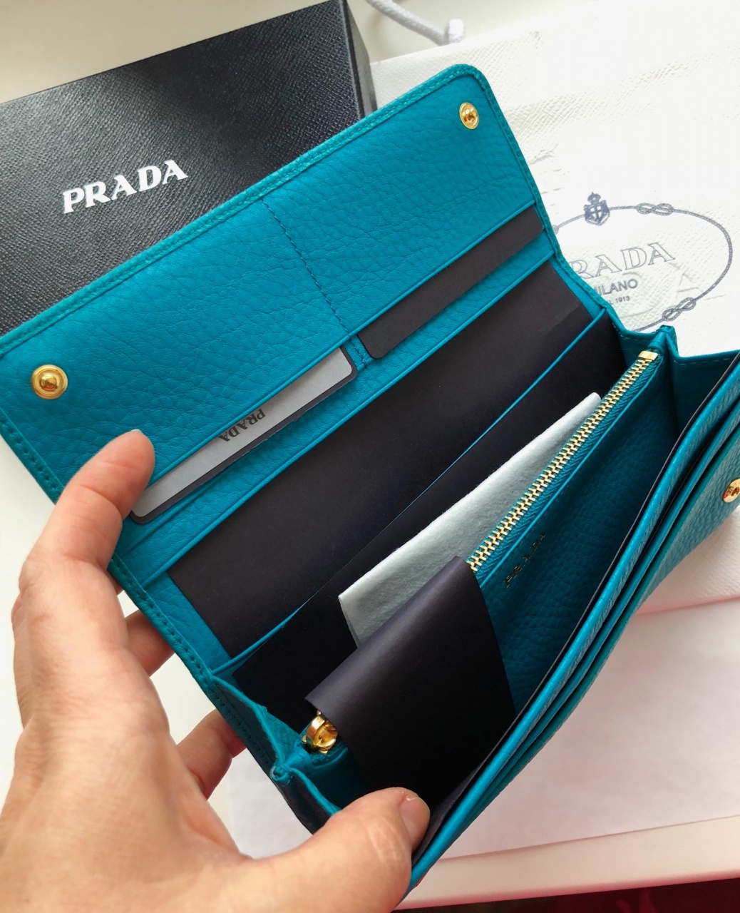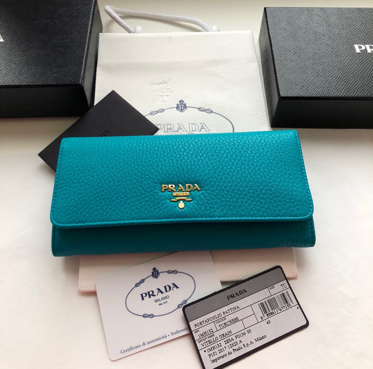Актуальная коллекция, со встроенными визитницами, которые у PRADA отдельно стоят не менее 8-12т.р. Мягкая зернистая кожа, выделки VITELLO GRAIN, очень ноская и стойкая к царапинам. Портмоне полноценного формата, 19см на 9,5см. Глубокого изумрудного цвета Turchese, с золотым металическим лого на клапане.