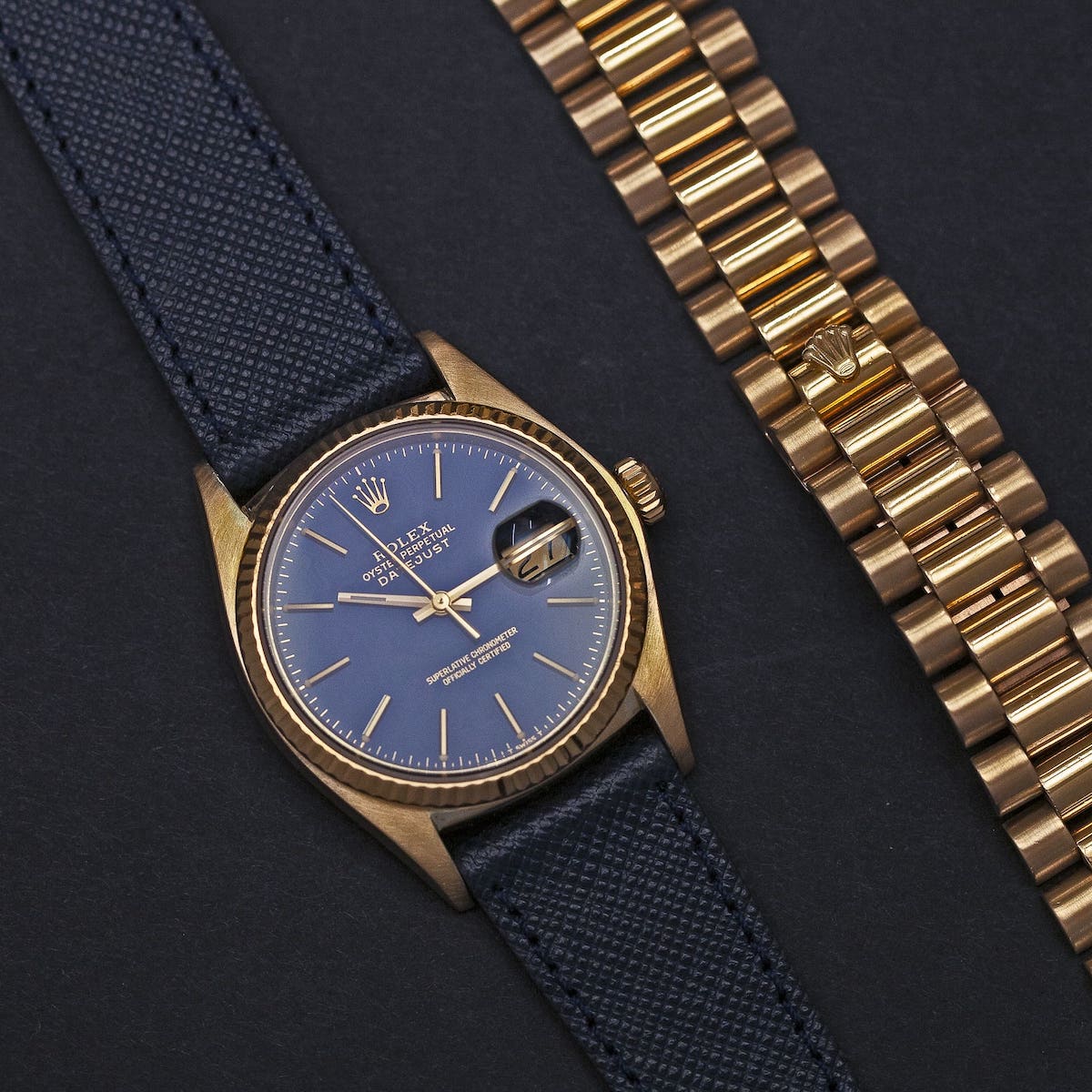 Комплект состоит из собственно часов, золотого 18к браслета ref 8385/55B, кожаного ремешка ручной работы (Италия), золотой 18к бакли, коробки Rolex и сертификата от оф. дилера, подтверждающего аутентичность.