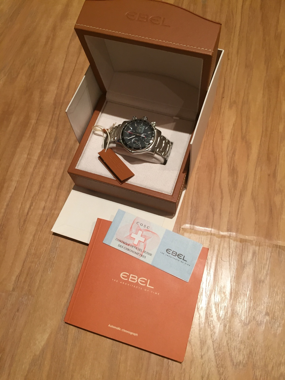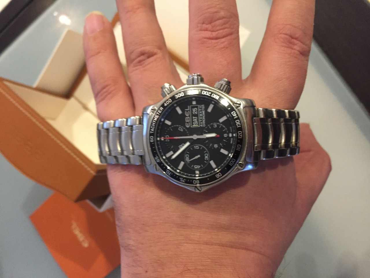Сертифицированный хронограф, EBEL Caliber 750 на базе надежного Valjoux 7750, оригинальный дизайн корпуса с винтами (всего их 17), массивный браслет в едином стиле - эти часы выглядят солидно и дорого, как и положено одному из лучших образцов часового искусства от EBEL.