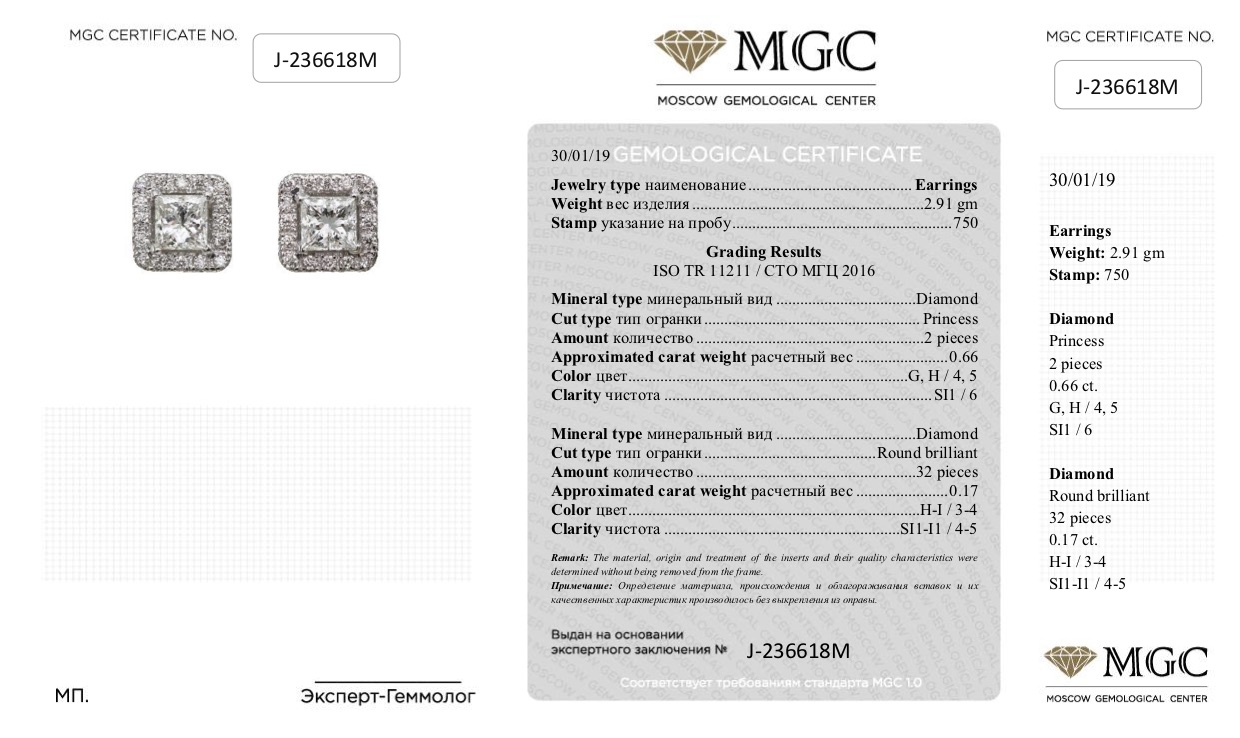 Серьги-пуссеты из белого золота с бриллиантами 0,83 карат (сертификат МГЦ)