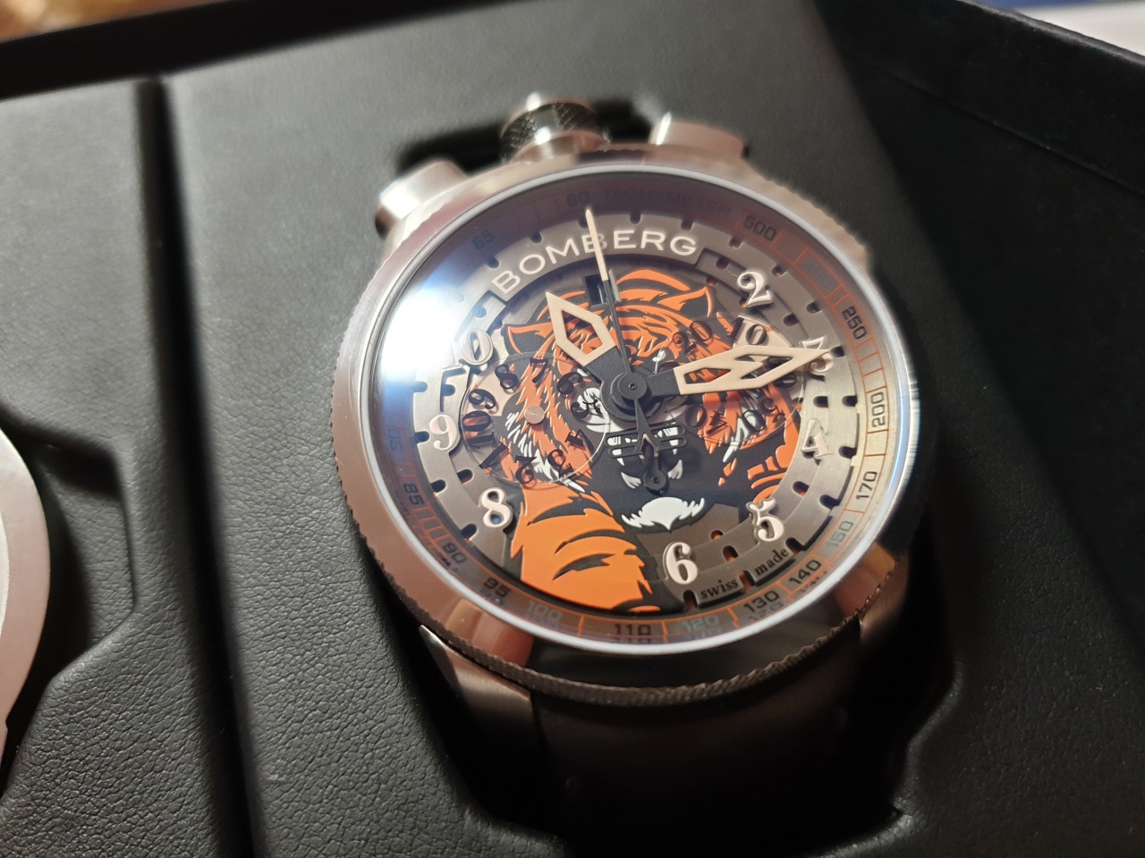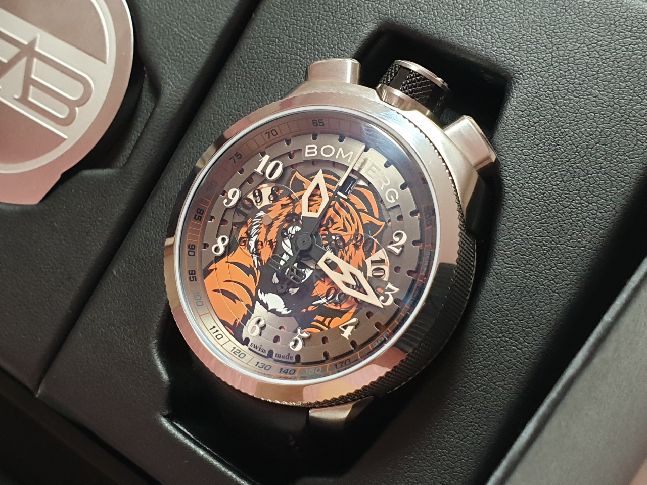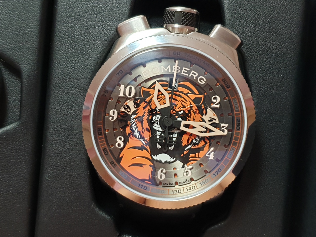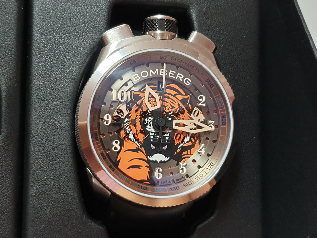 BOLT-68 Tiger Chronograph. Часы-трансформер с хронографом, секундомером и тахиметром. Секундомер с точностью 1/10с. Массивные заводная головка и кнопки управления хронографом. Байонетная система крепления корпуса часов к основанию. Можно использовать как наручные или карманные часы. Завинчивающаяся заводная головка. В комплекте цепочка и медальон.