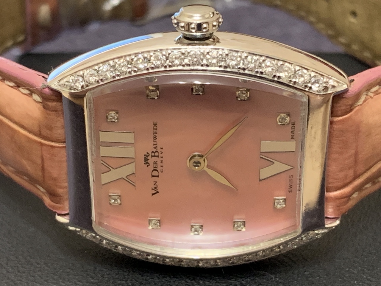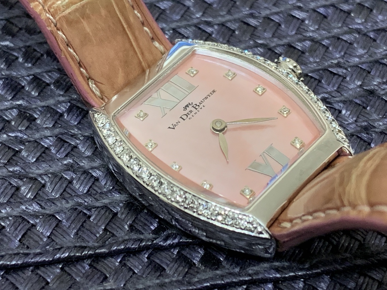 Механизм VDB cal. 95. Корпус и перламутровый циферблат украшены бриллиантами. Ремешок из кожи крокодила.