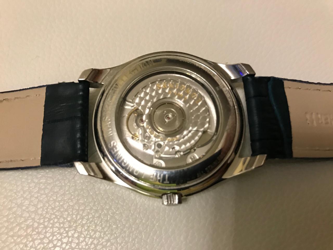 Есть родной браслет, со следами ношения на изнанке. Я заменил на синий кожаный ремешок в тон стрелкам.