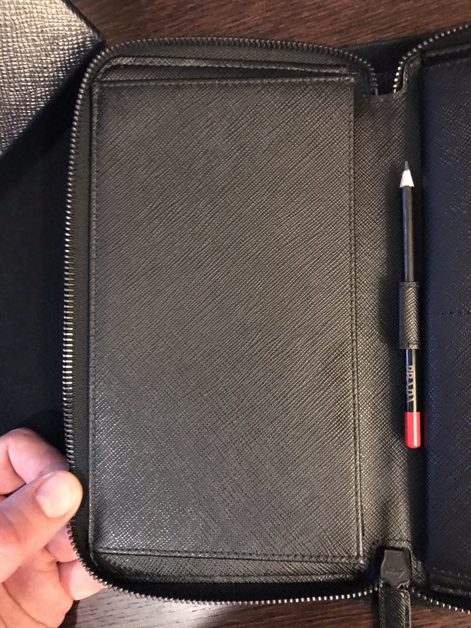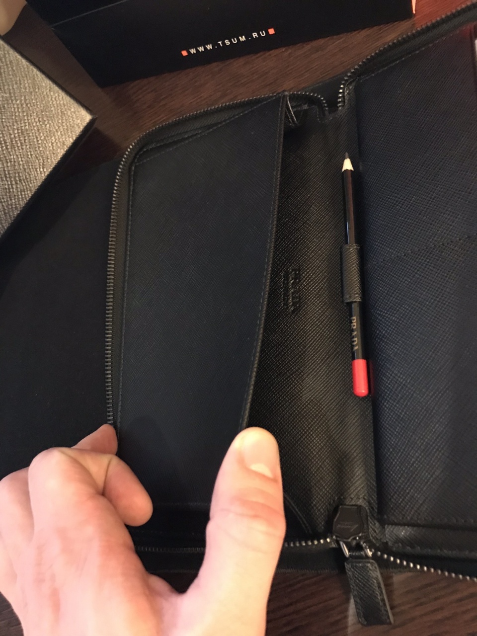 Знаменитая кожа выделки Saffiano, цвет черный (Nero), кожа очень ноская. На лицевой стороне угловое металлическое логок, роскошная черненая фурнитура. Размеры 21 на 11 см, толщина 2,5 см.Внутри слева большой отсек-карман для денег-документов, по середине держатель с карандашом PRADA, справа 12 слотов для кредиток, отделение на молнии, 3 больших глубоких отсека для денег\прав\паспорта и тд. Прекрасно смотрится в руке или в деловом портфеле.