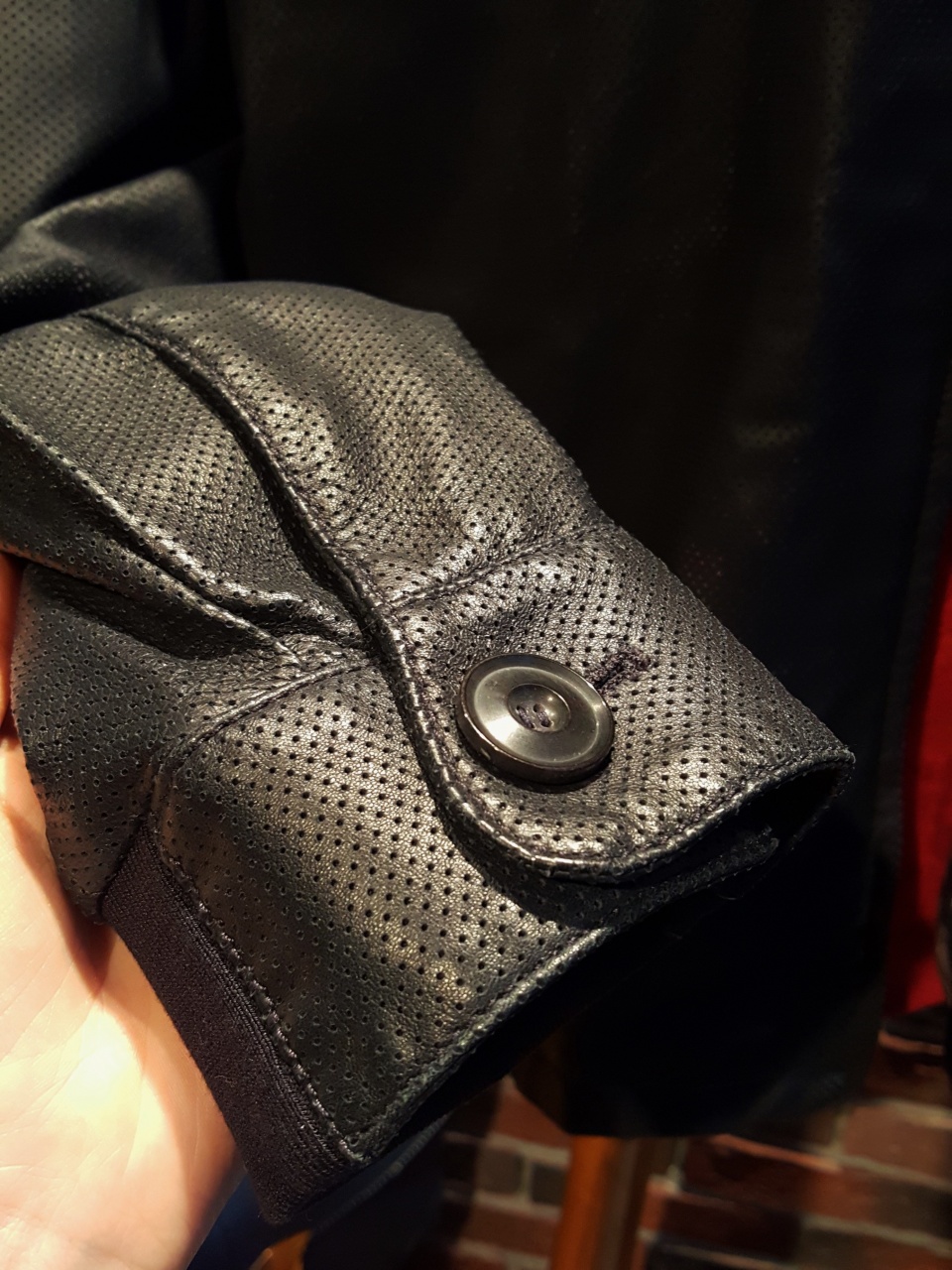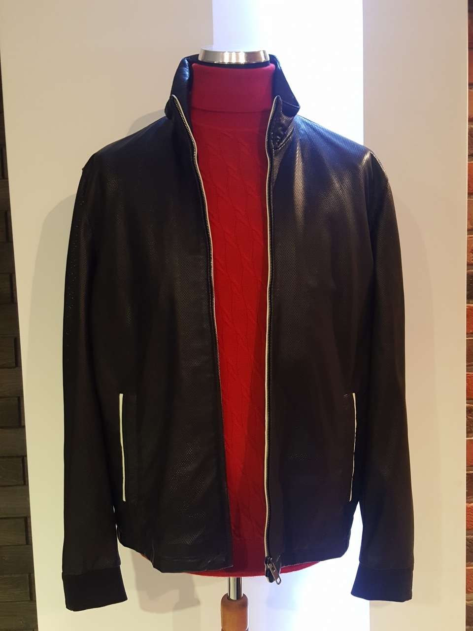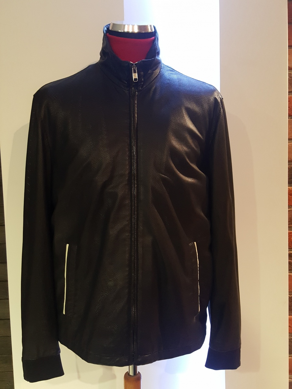 Куртка изготовлена из 100% телячьей кожи высочайшего качества выделки с нанесенной лазерной «перфорацией».