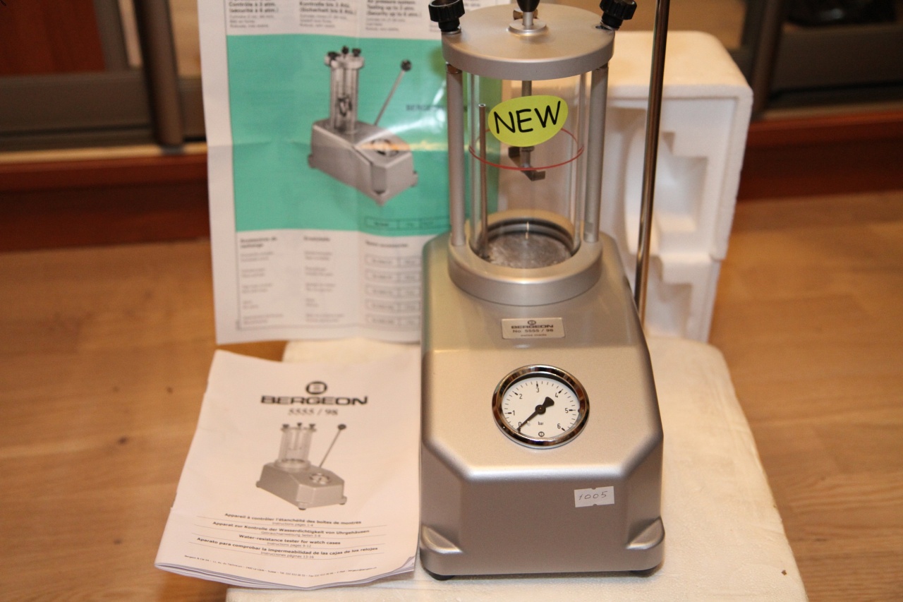 BERGEON 5555. Он состоит из колбы, наполовину наполненной жидкостью, ручного воздушного насоса и крышки с подвижным держателем корпуса часов. Порядок проверки герметичности следующий. Сперва корпус часов фиксируется над поверхностью жидкости, крышка прибора герметично закрывается и над поверхностью воды создается избыточное давление в 3 атмосферы. Часы выдерживаются 1–2 минуты над поверхностью, и если корпус негерметичен, то давление внутри него сравнивается с избыточным внешним. Затем часы подвижным держателем опускаются в воду, и давление из-под крышки постепенно стравливается.