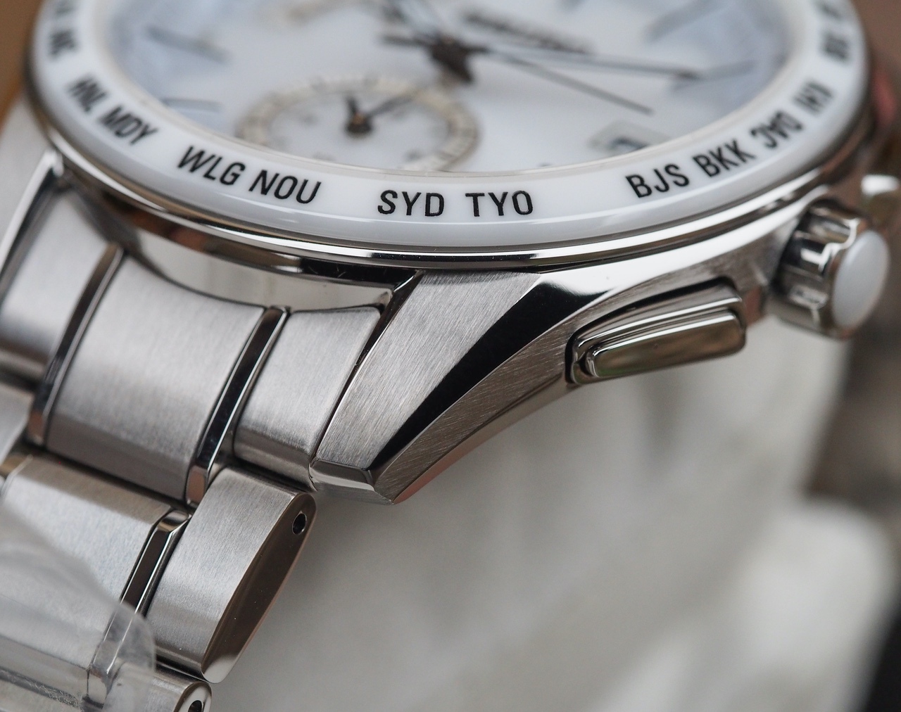 Белая керамика на безеле с гравировкой названий часовых поясов