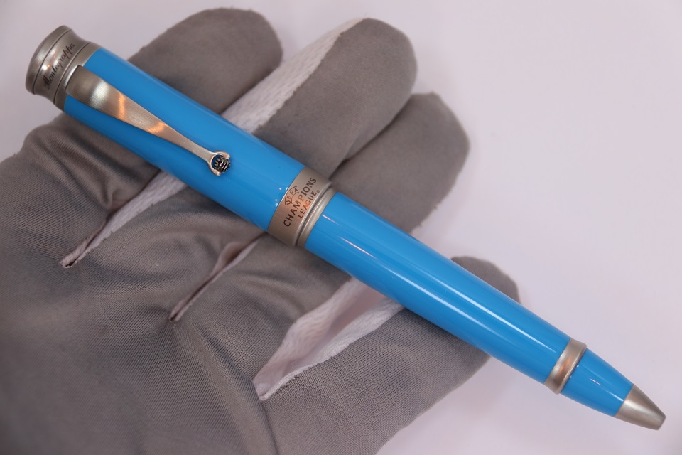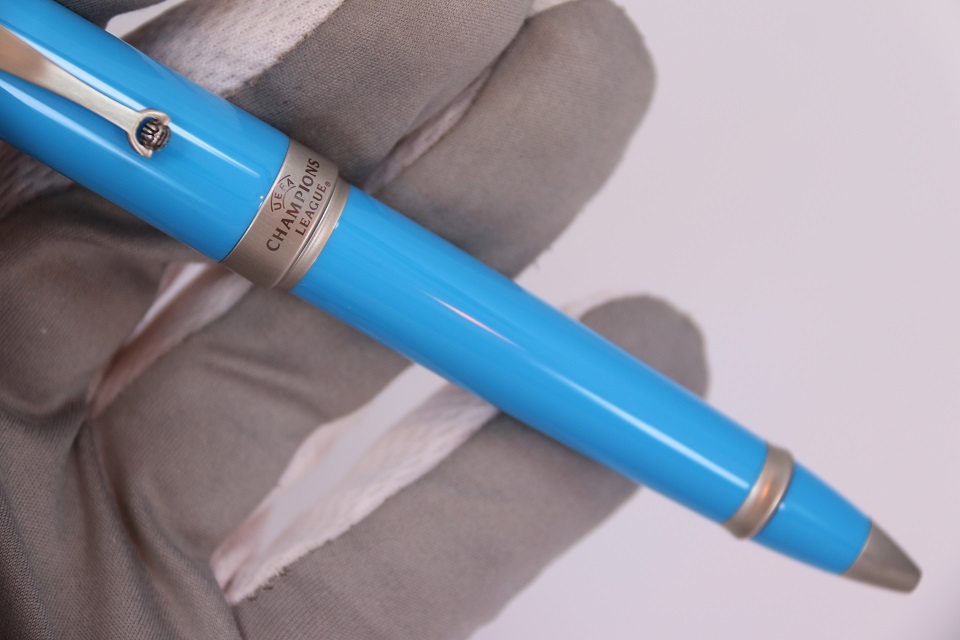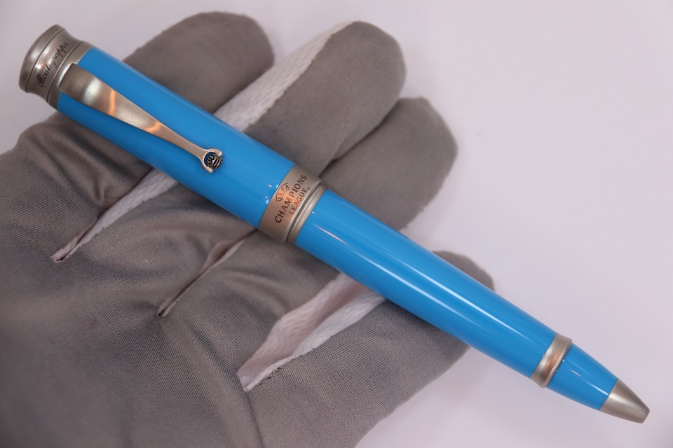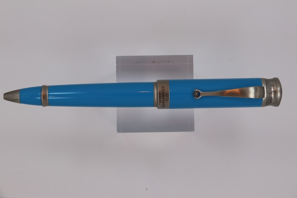 Шариковая ручка Montegrappa UEFA Champions League Light Blue выполнена из смолы, а другие элементы дизайна - из нержавеющей стали с сатиновым эффектом. Торец колпачка украшает известный логотип Лиги Чемпионов в виде соприкасающихся звезд, сбоку от которого нанесена классическая надпись 'Montegrappa', а на широком кольце колпачка нанесен еще один логотип Лиги Чемпионов УЕФА. Завершает уникальный дизайн традиционный для Монтеграппы шарик на конце клипа, но исполненный в виде футбольного мяча. Ручка поставляется в специальном футляре, также украшенном логотипом UEFA Champions League.