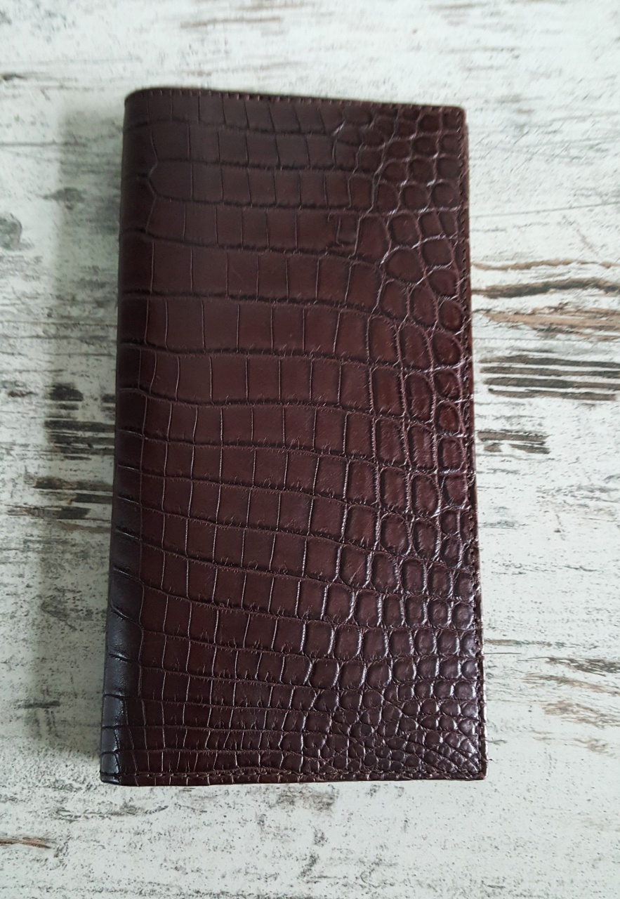 Портмоне окрашено вручную в коричневый цвет. Изготовлено из цельного куска кожи с живота крокодила. Портмоне имеет четыре больших отделения для банкнот (рубли, евро, доллары) и 14 (четырнадцать) отделений для кредитных карт или визиток.