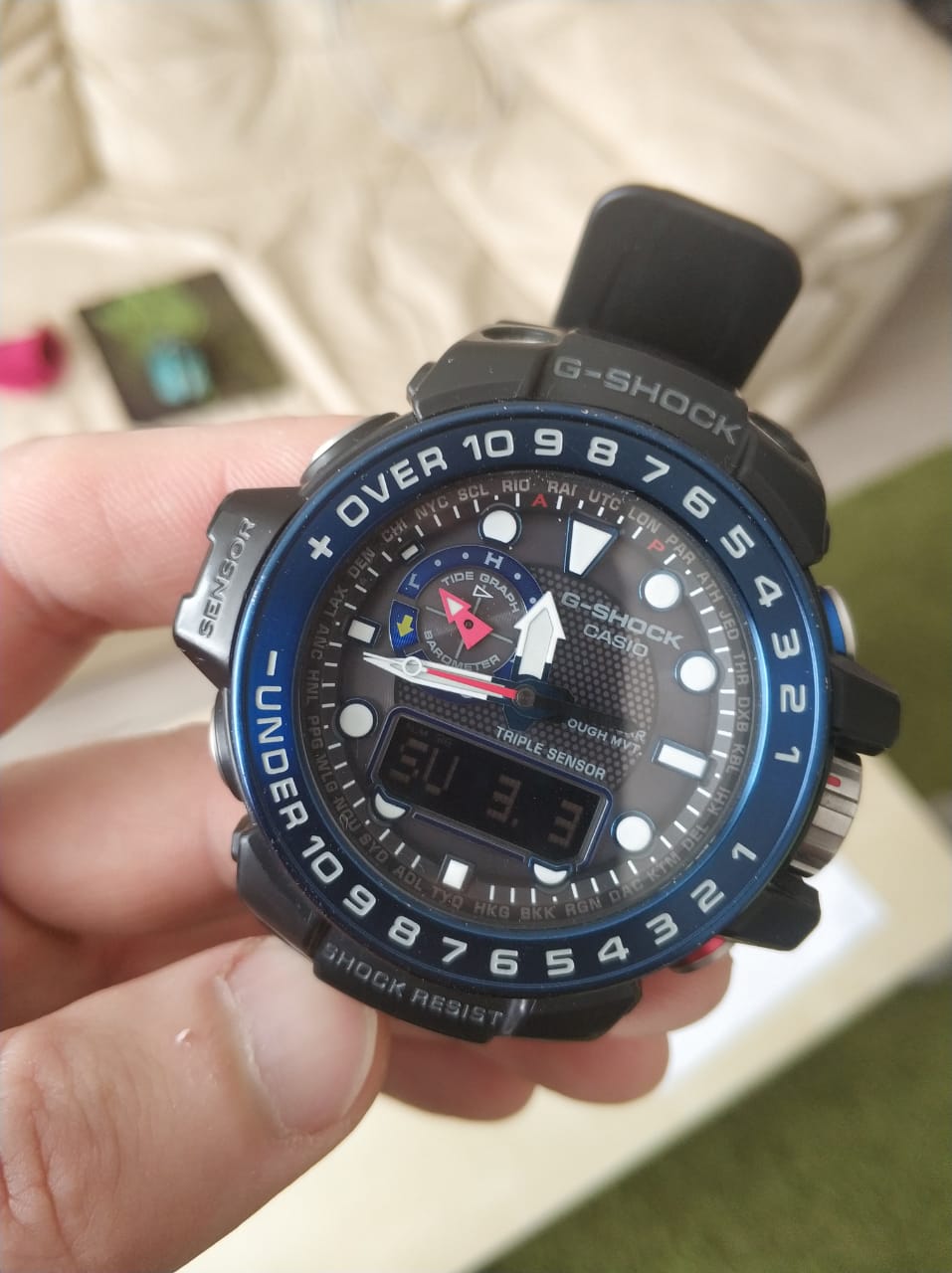 Описание из интернета - наручные часы от японского производителя Casio Gulfmaster GWN-1000B-1B были разработаны специально для тех, кто любит плавать в море и заниматься водным спортом. Это первая модель из серии G-Shock, у которой есть комбинированный дисплей и тройной сенсор, т.е. присутствуют барометр, термометр и компас. Также есть двойная подсветка двух циферблатов. Подсветка полностью автоматическая и светодиодная, активируется при повороте вашей кисти. Питается модель Gulfmaster GWN-1000B-1B от солнечной батарейки, срок службы которой около 10 лет. Корпус часов влагозащищен и ударопрочен. Также присутствует много интересных функций, с которыми Вы сможете дополнительно ознакомиться.
