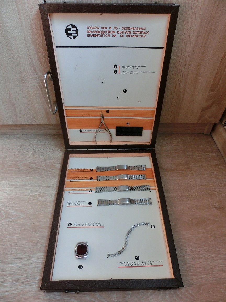 Это демонстрационный набор для показа в высших партийных сферах от некоего предприятия, скорее всего военного предназначения. В то советское время (12 пятилетка - 1986-1990 гг.).в стране не хватало предметов бытового потребления. Именно тогда ракетные заводы начали шлепать алюминиевые кастрюльки и тазики. А этот КБН и ХО предложил делать, помимо основной продукции - кусачки, браслеты и корпуса часов... Называлось это тогда - конверсией.
