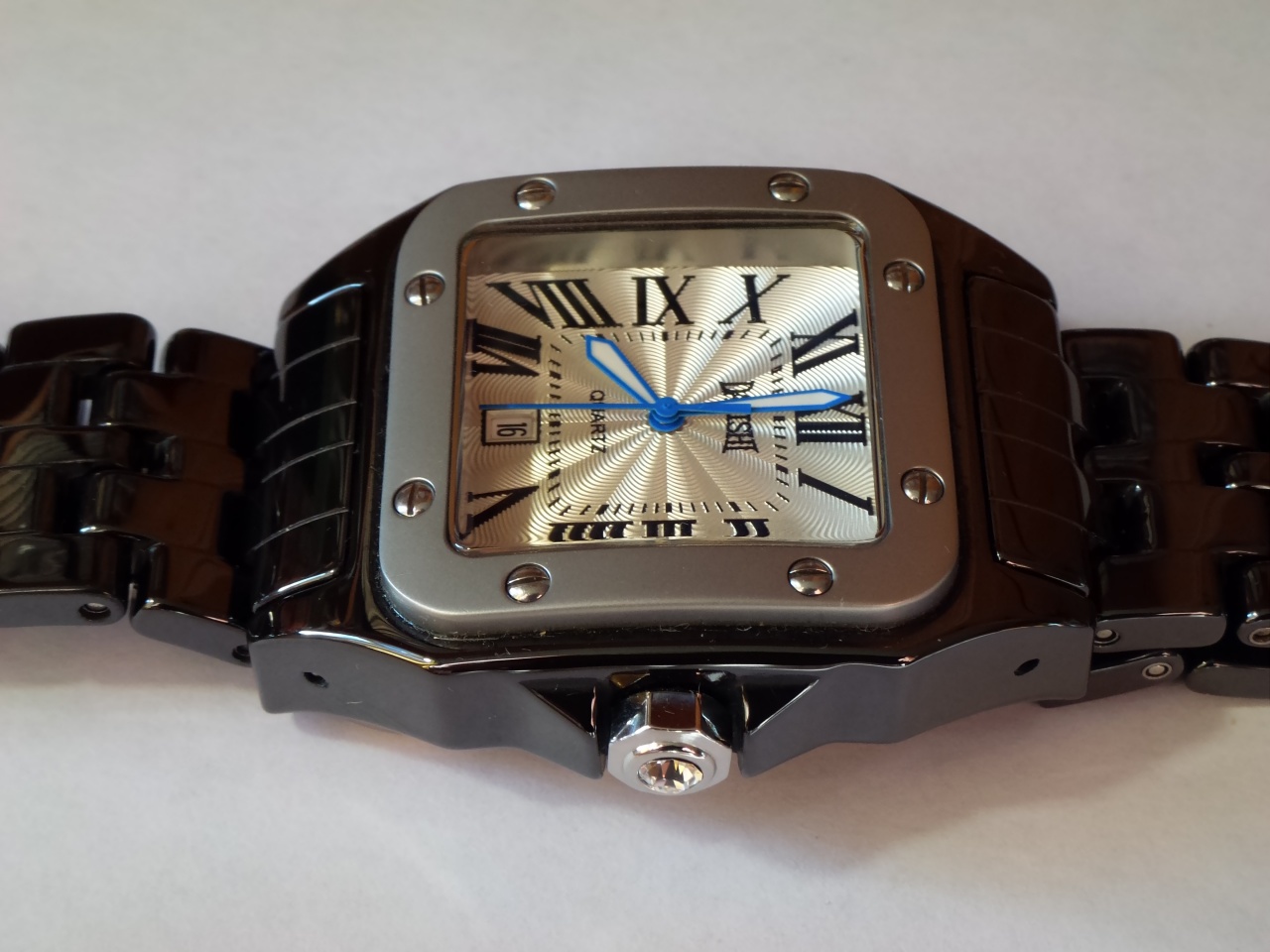 Приобрел в основном из интереса, хотелось в руках подержать часы из керамики, а тут за небольшие деньги представилась такая возможность. Часы на простом кварцевом механизме, производства Япония. Эту информацию я обнаружил, когда менял батарейку. Механизм хлипенький, но работает, и довольно точно. Часы выполнены похожими на продукцию фирмы Картье. Качество керамического корпуса я бы оценил на тройку по сравнению с мировыми брендами. Есть недополированные места, сколы, окислы металлов. Стекло обещали сапфировое, но у меня подозрение, что это не так. На заводной головке зачем то стразик приклеили, по моему смотрится нелепо и дешево. Часы тяжелые. Керамика, возможно, представляет собой спеченый карбид титана. Одевал их всего пару раз, с тех пор лежат просто в коллекции, как образец.