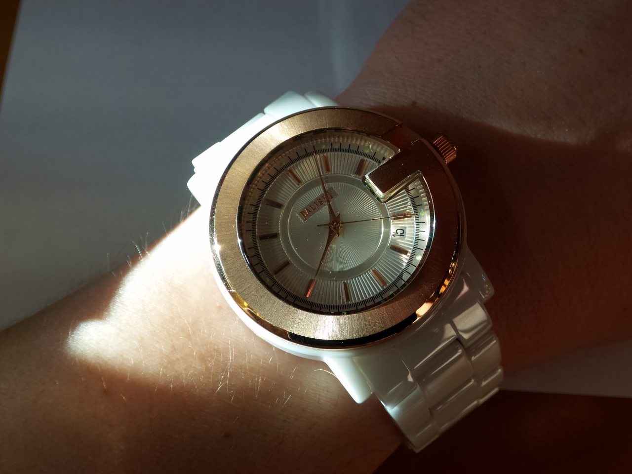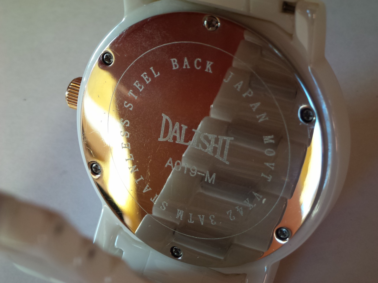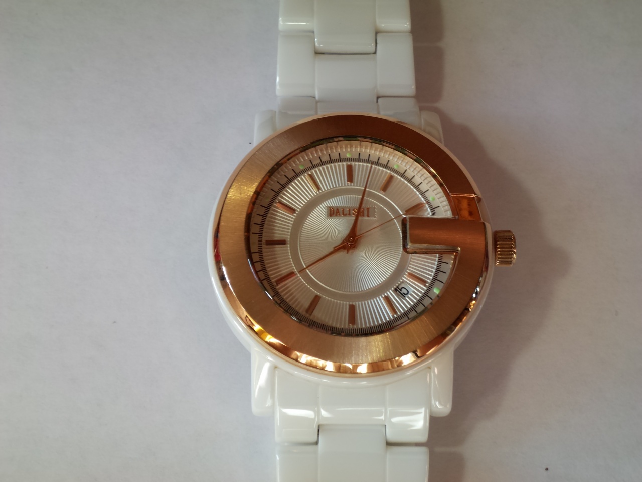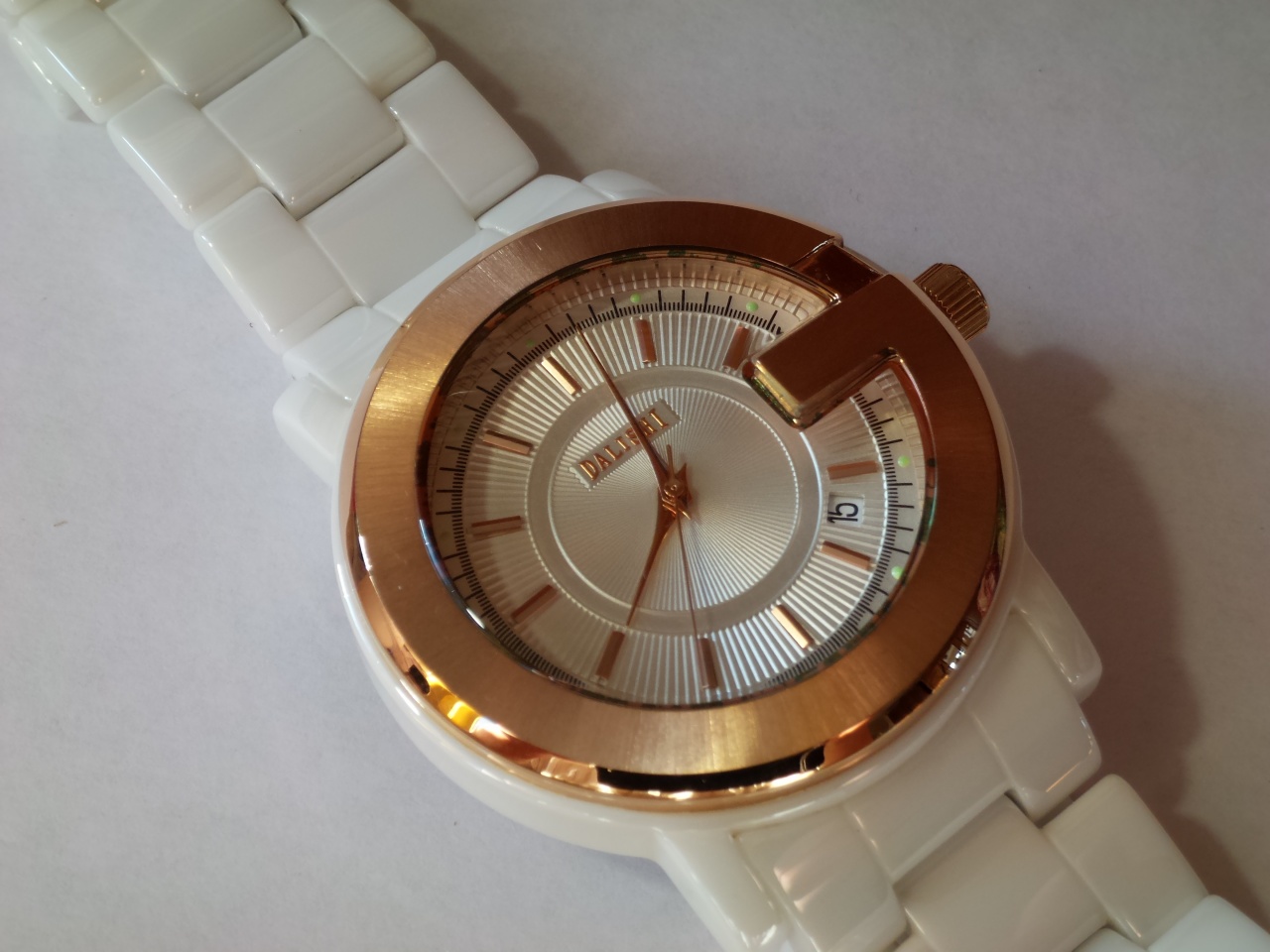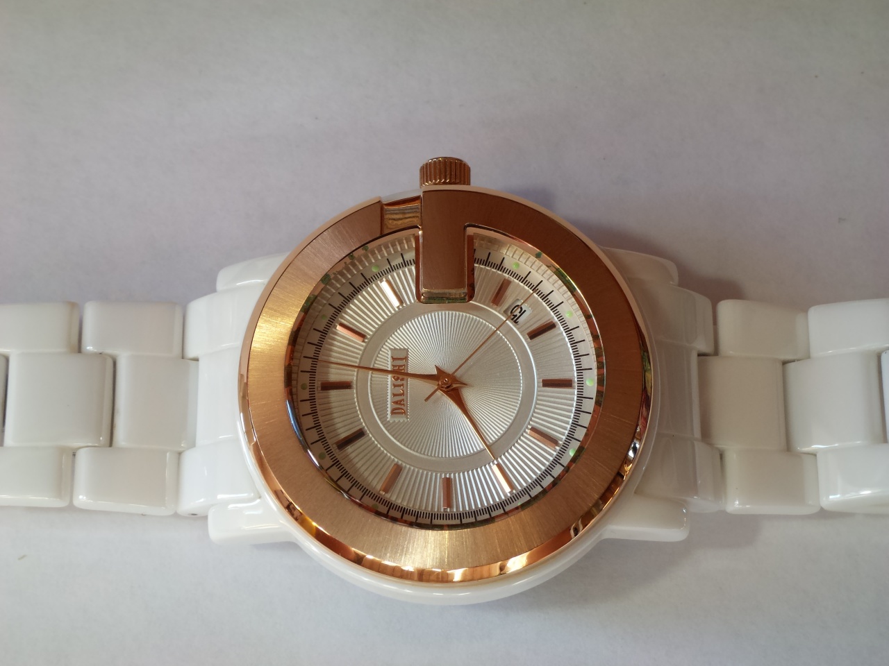 Вместе с часами из черной керамики, мне довелось приобрести часы из белой керамики, всё того же бренда Dalishi. Механизм внутри корпуса установлен также японский. Корпус из белой керамики(оксид циркония), на мой взгляд выполнен аккуратней, чем из черной. "Безели" на обоих часах видимо приклеены к корпусу, так как иного способа совместить эти детали производитель, наверное не нашел. Следы клея кое где заметны. Все, якобы металлические детали корпуса имеют декоративные покрытия, долговечность которых вызывает сомнения. То есть, если часы носить каждый день, то заводные головки, безели, оботрутся и будет виден материал основы этих деталей. Браслеты собраны на шпильки. В отверстиях под шпильки(в звеньях браслета), установлены специальные втулки, чтобы не треснула керамика. Ход часов точный. Товарищ носит подобные керамические часы, без декоративных элементов из металла, более года, и они не имеют следов износа.