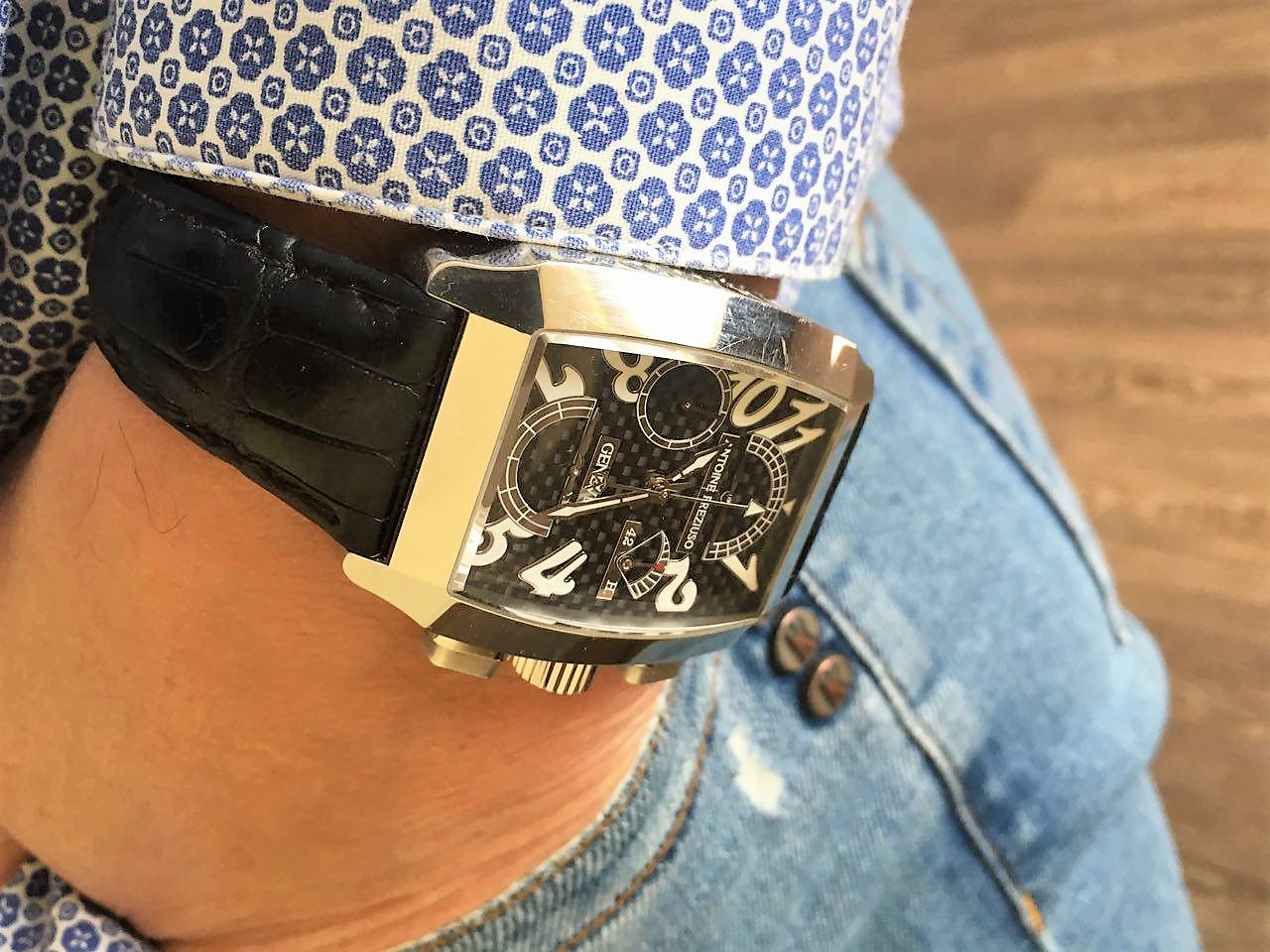 Прочный изогнутый прямоугольный корпус размерами 50 x 38 мм выполнен из нержавеющей стали. Черный двухуровневый циферблат, выполненный из углеродного волокна, оснащен часовыми метками в виде больших арабских наклонных цифр.