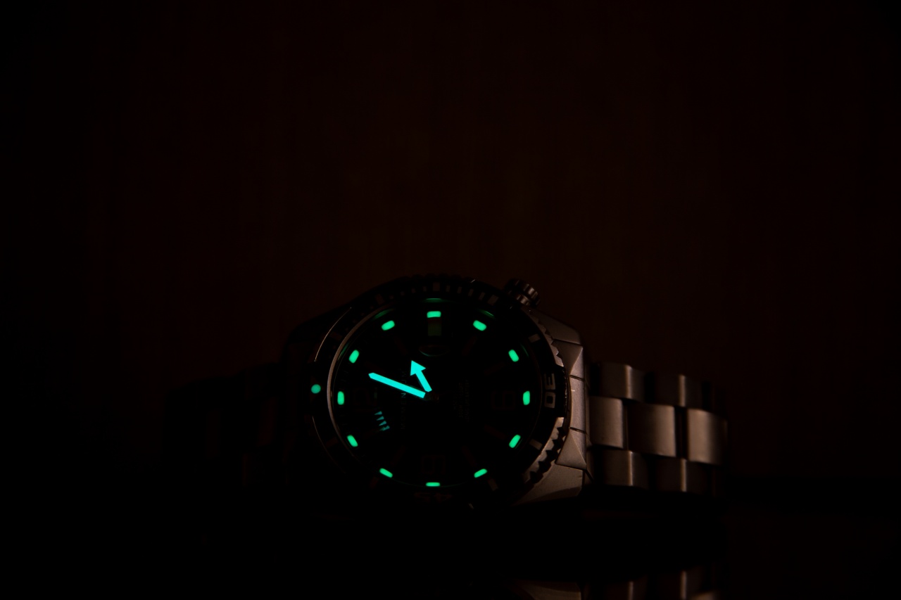 Черный цифер, полированные серебристые метки, люминофор на стрелках и метках.