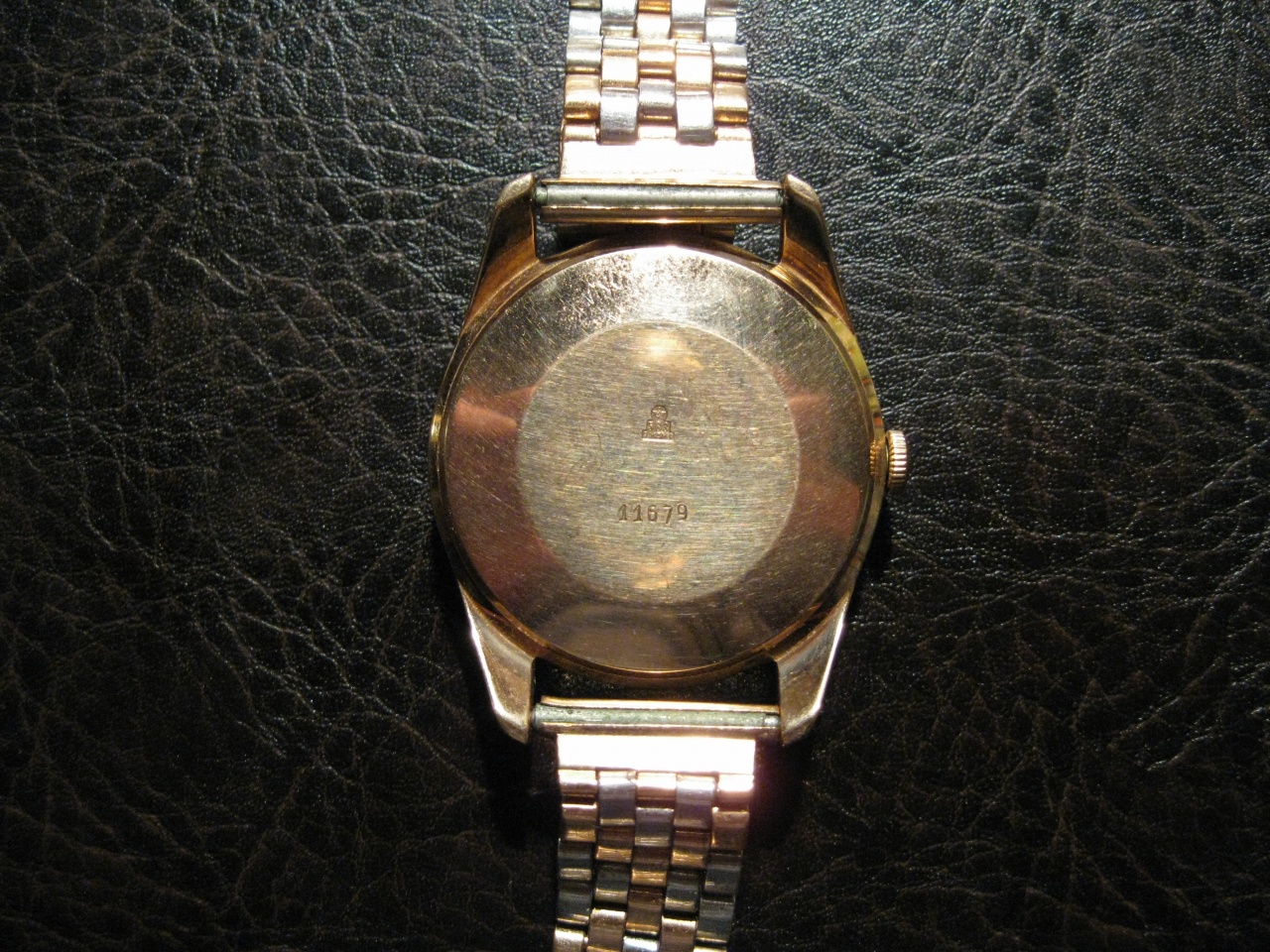 Главная проблема в том, что часы идут с браслетом. Ценник утрачен. Если стоимость часов в то время известна - 175 руб., то браслет по словам владельца стоил в те времена невероятных денег - несколько тысяч. Вес неизвестен, да и мало что он даст. Потому, что состоит из двух металлов: желтого и белого примерно в равных количествах. Внешняя часть застежки желтого металла на внутренней стороне имеет пробу 583. Внутренняя часть застежки белого цвета (как утверждают платина) имеет клеймо (насколько удалось рассмотреть - КЮО) и пробу 950. Браслет большой и необыкновенно красивый. Очень подходит к этим часам. Несколько звеньев связаны ниточкой, что бы не укорачивать.