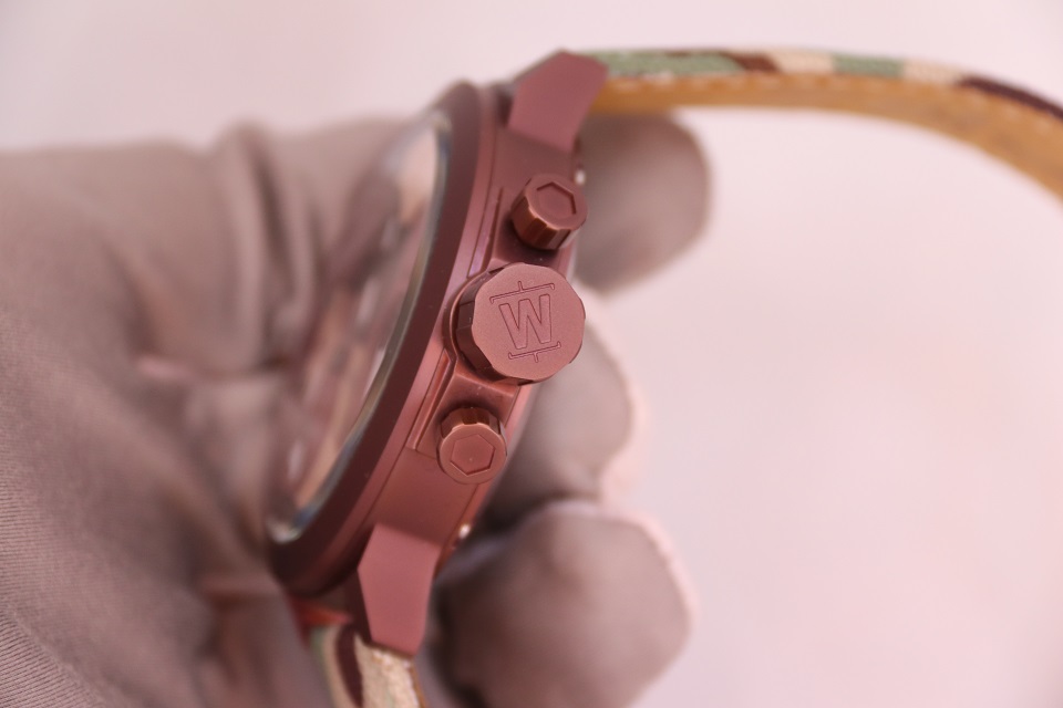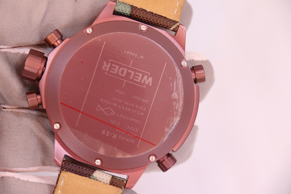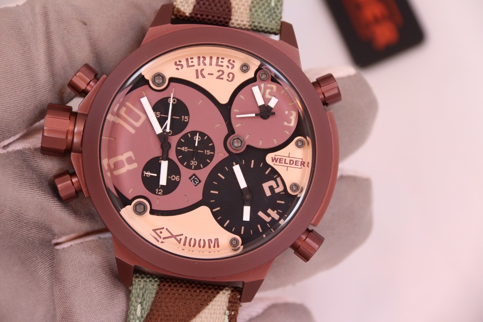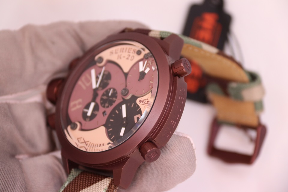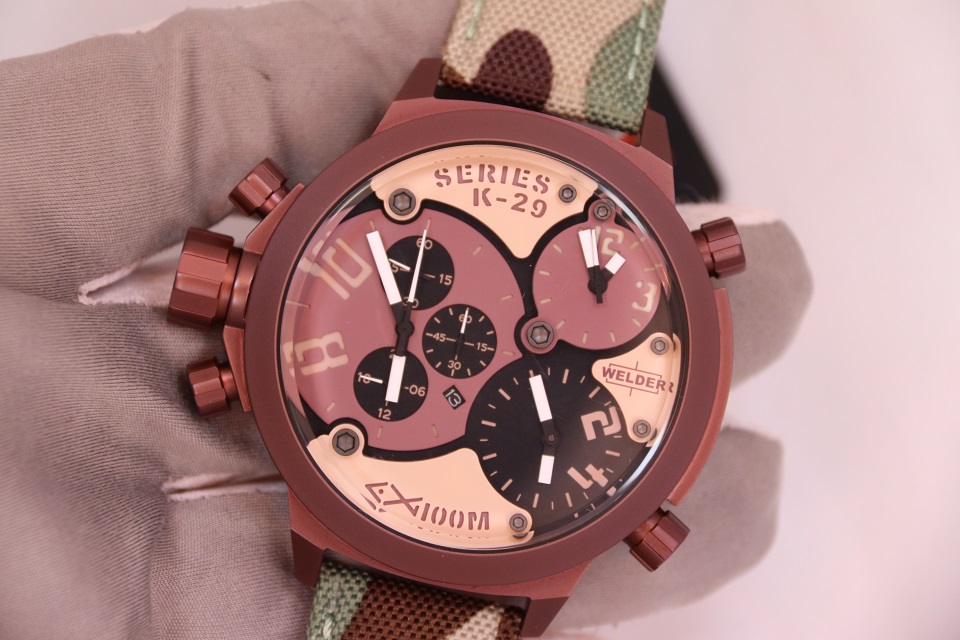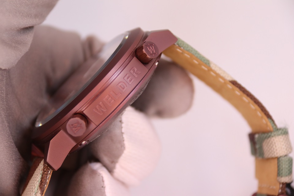 Часы крепятся на руке широким тканевым ремешком, по текстуре похожим на грубую промышленную ткань, из которой делают тягловые тросы. Ремешок повторяет рисунок камуфляжной армейской формы. Модель имеет несколько заводных головок-клапанов, расположенных по обеим сторонам от корпуса: Welder и не думал делать их миниатюрными: ведь они, в первую очередь, должны быть функциональными и удобными.
