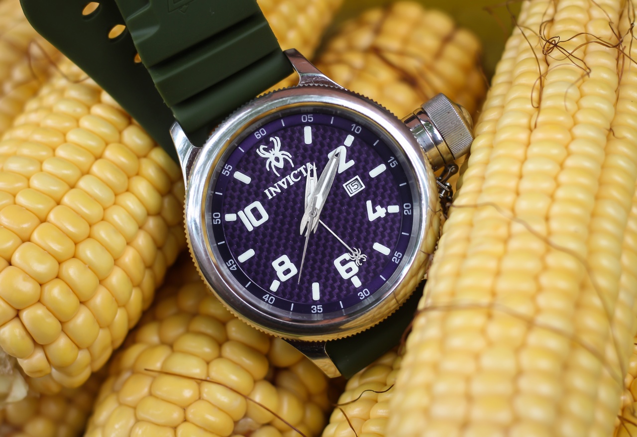 Швейцарский механизм Ronda,циферблат небанального цвета с текстурой карбон,гравировка Invicta сбоку корпуса,неплохой люм нанесен даже на лого в виде паука,